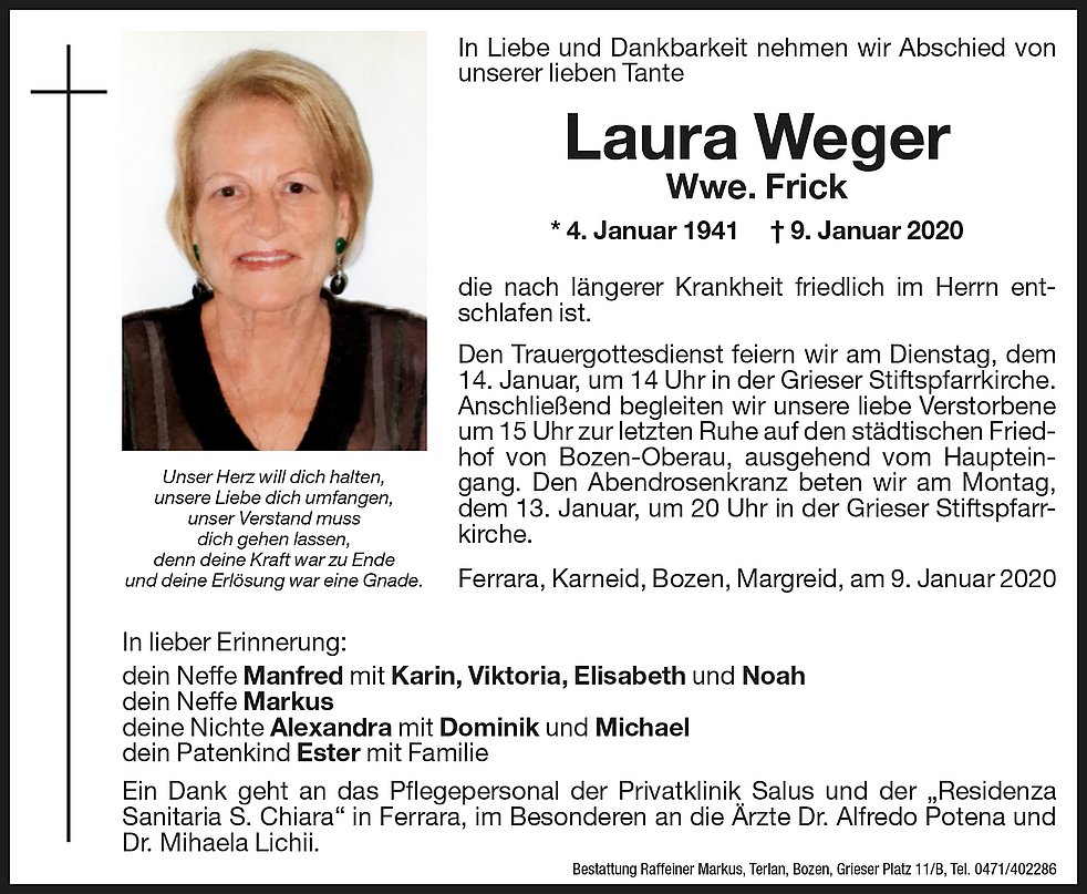 Den Trauergottesdienst feiern wir am Dienstag, dem 14. Januar, um 14 Uhr in der Grieser Stiftspfarrkirche. Anschließend begleiten wir unsere liebe Verstorbene um 15 Uhr zur letzten Ruhe auf den städtischen Friedhof von Bozen-Oberau, ausgehend vom Haupteingang.