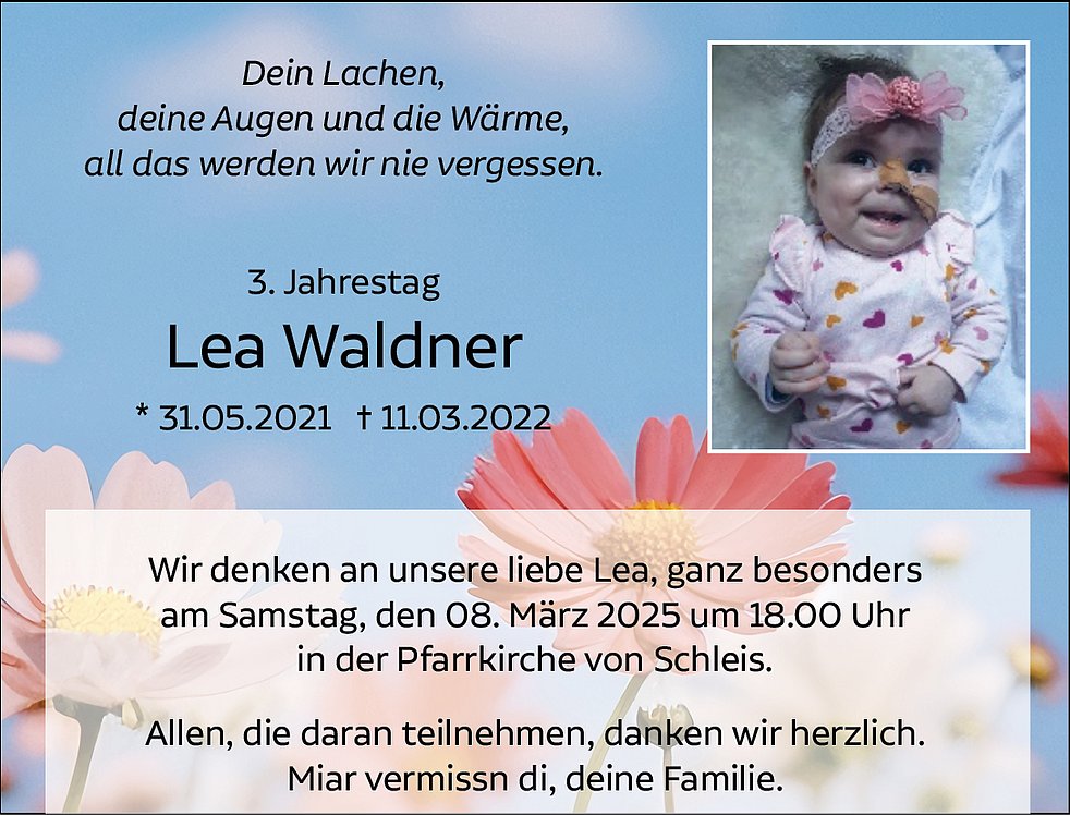 Am Freitag, 18. März, um 13.30 Uhr beten wir den Rosenkranz beim Trauerhaus; um 14 Uhr begleiten wir unsere liebe Lea zum Engelamt in die Pfarrkirche von Schleis; anschließend erfolgt die Beisetzung im Ortsfriedhof.