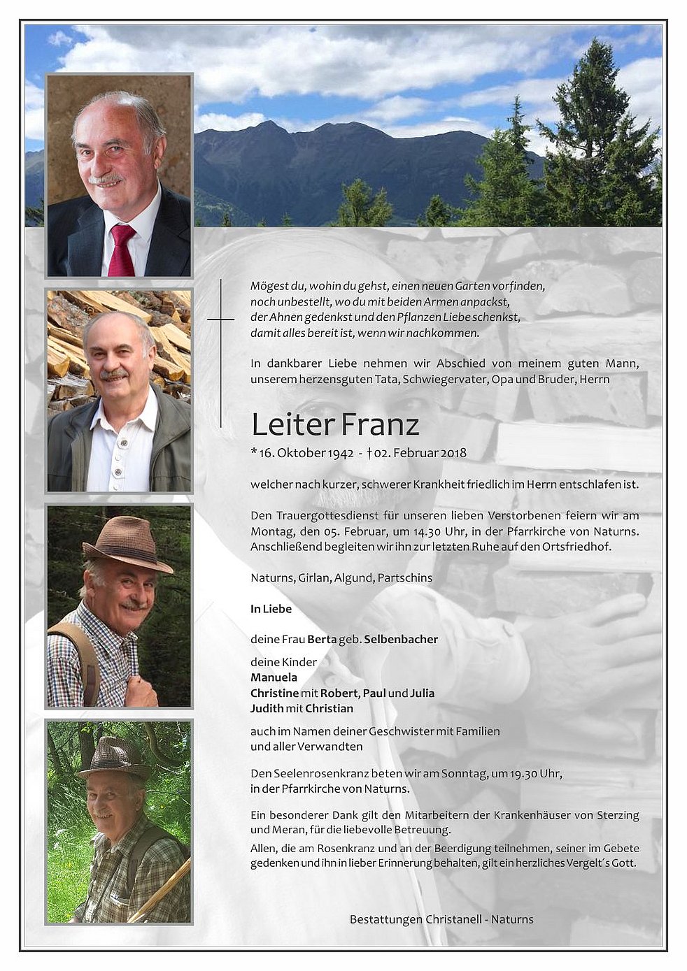 Den Trauergottesdienst für unseren lieben Verstorbenen feiern wir am Montag, den 05. Februar, um 14.30 Uhr, in der Pfarrkirche von Naturns. Anschließend begleiten wir ihn zur letzten Ruhe auf den Ortsfriedhof.
