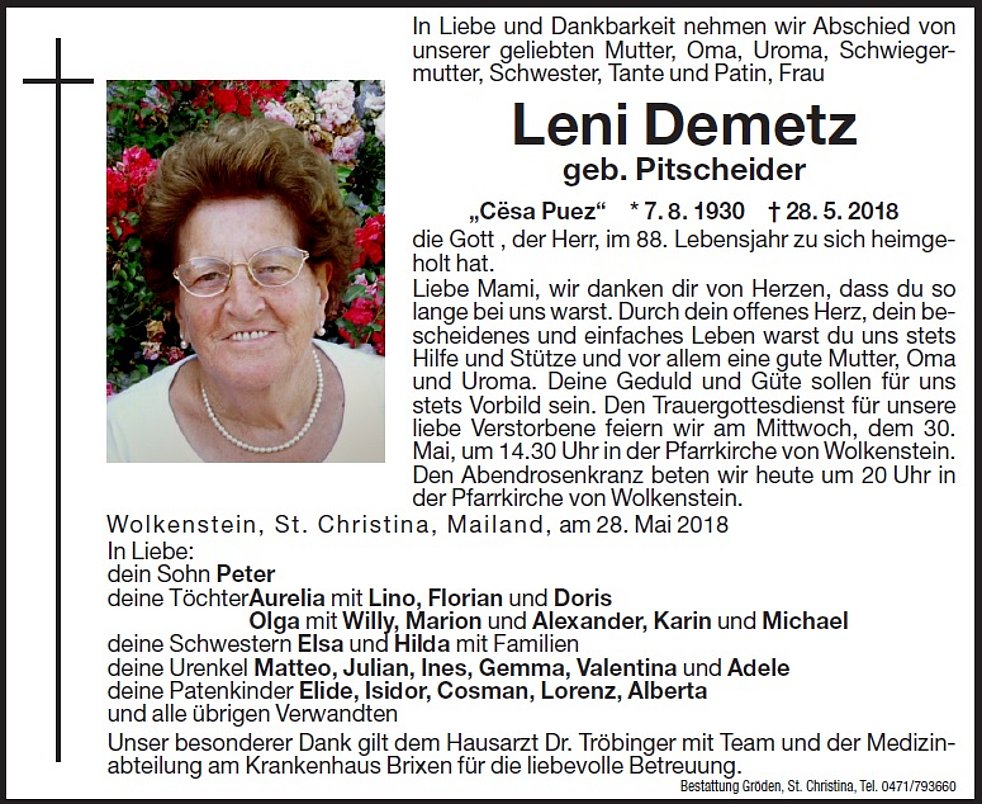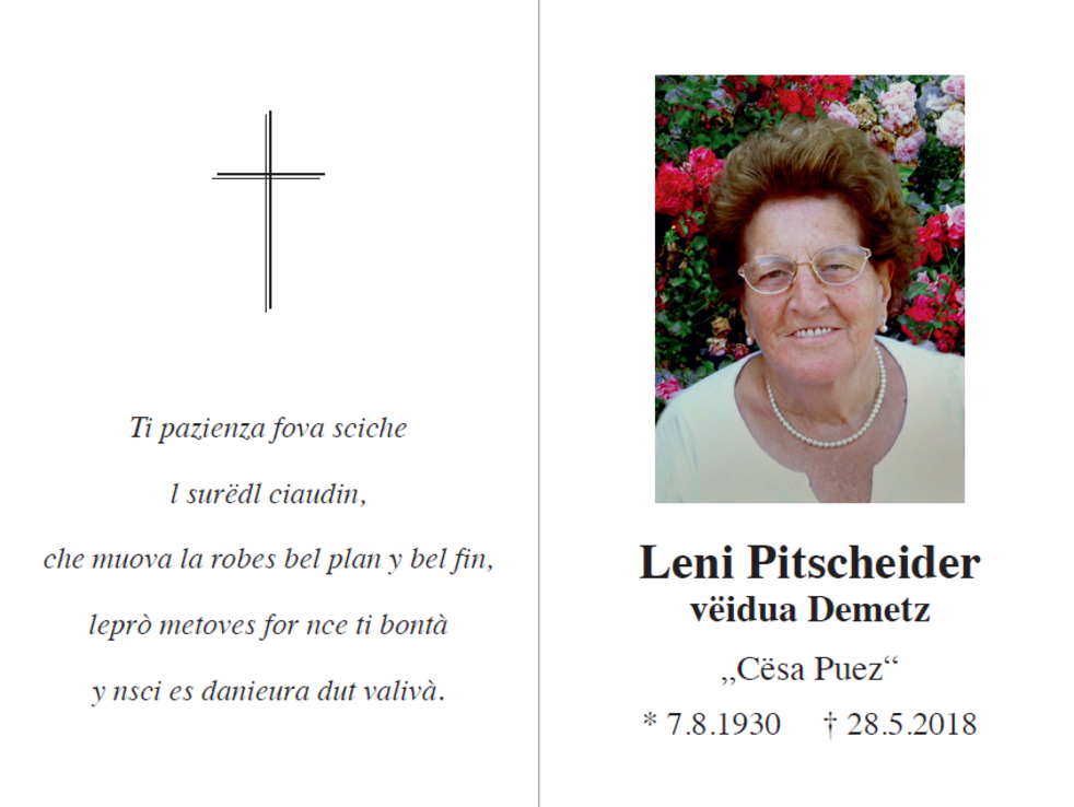 Den Sterbegottesdienst für unsere liebe Verstorbene feiern wir am Mittwoch, dem 30. Mai, um 14.30 Uhr in der Pfarrkirche von Wolkenstein.