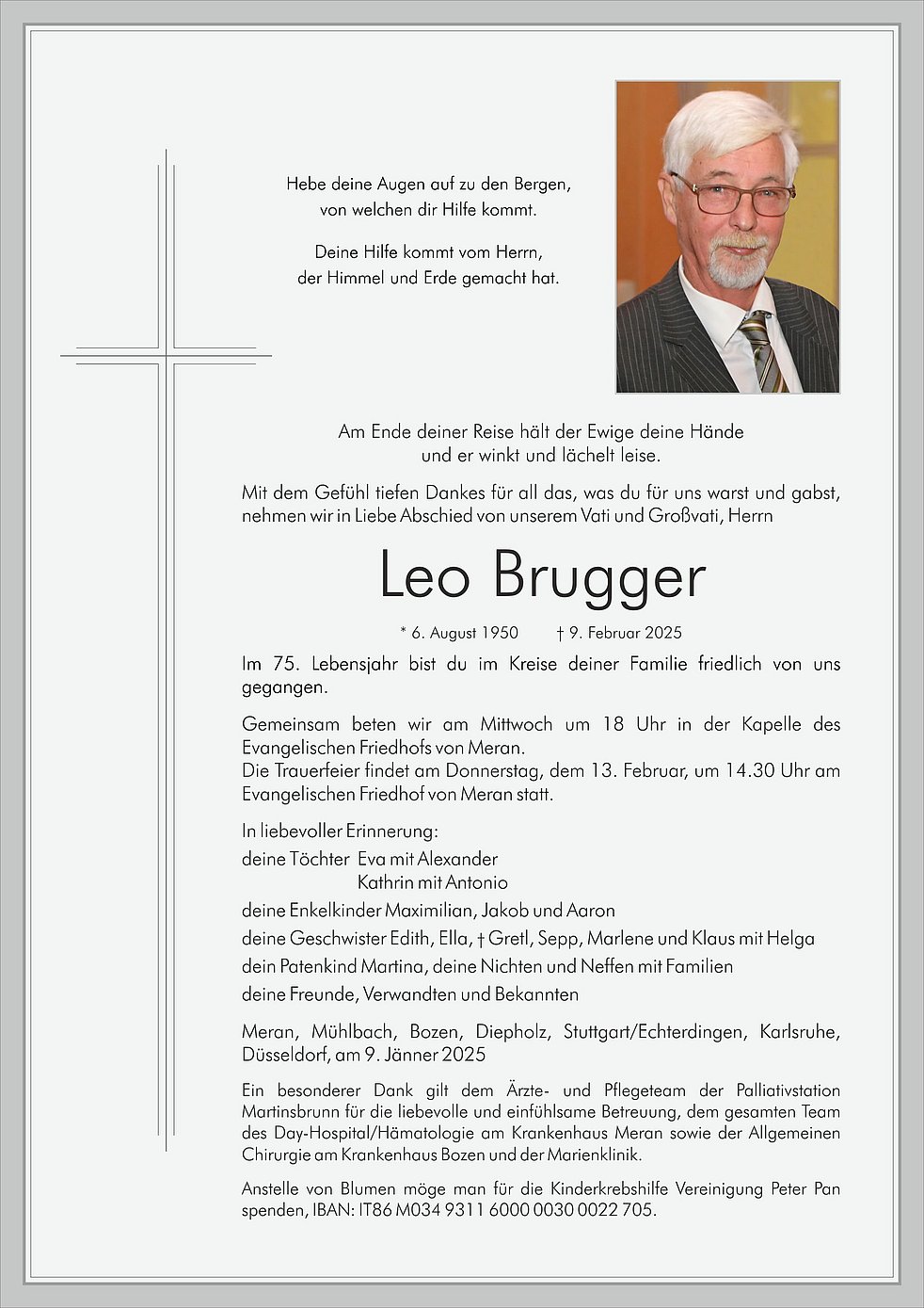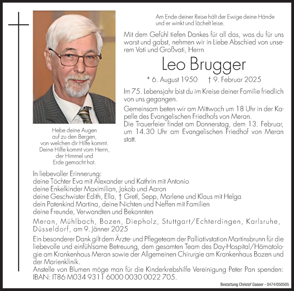 Anstelle von Blumen möge man für die Kinderkrebshilfe Vereinigung Peter Pan spenden, IBAN: IT86 M034 9311 6000 0030 0022 705.