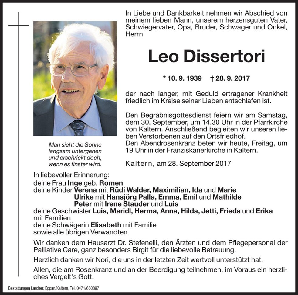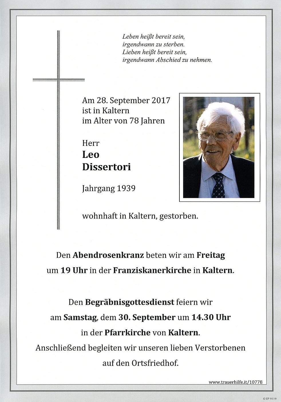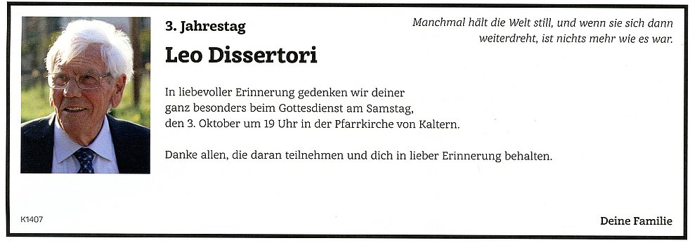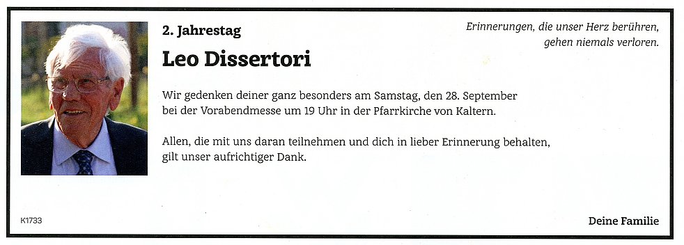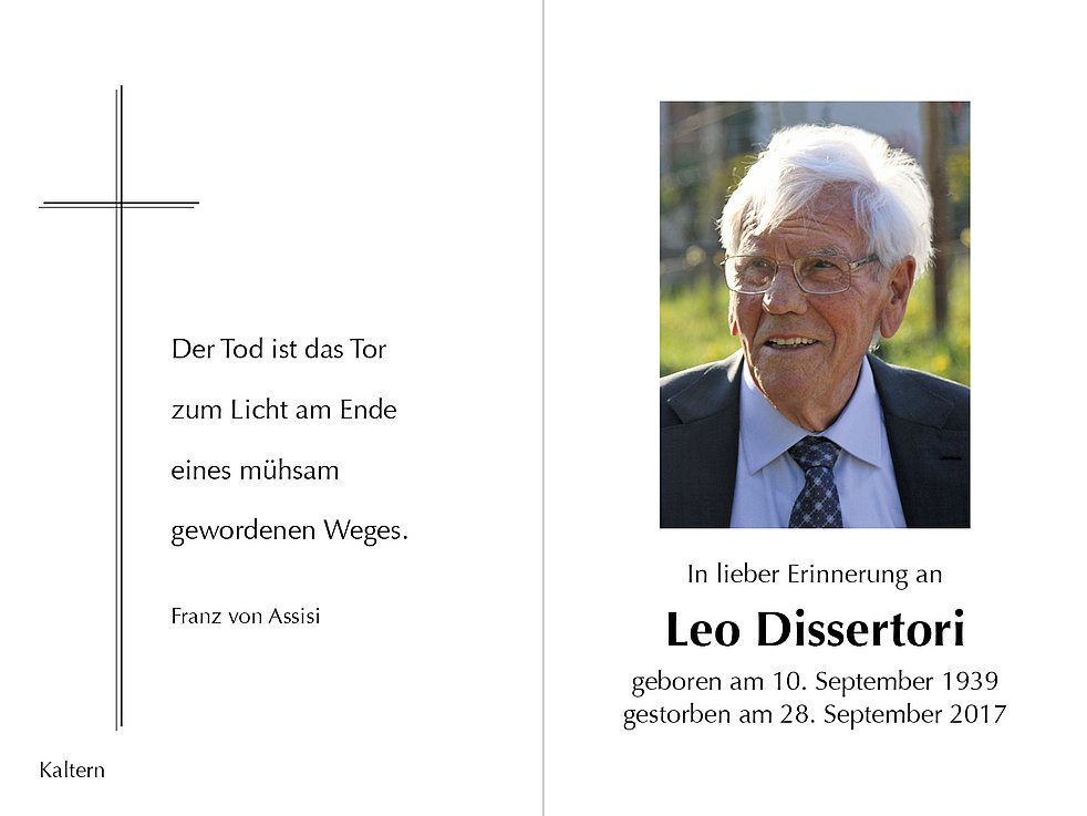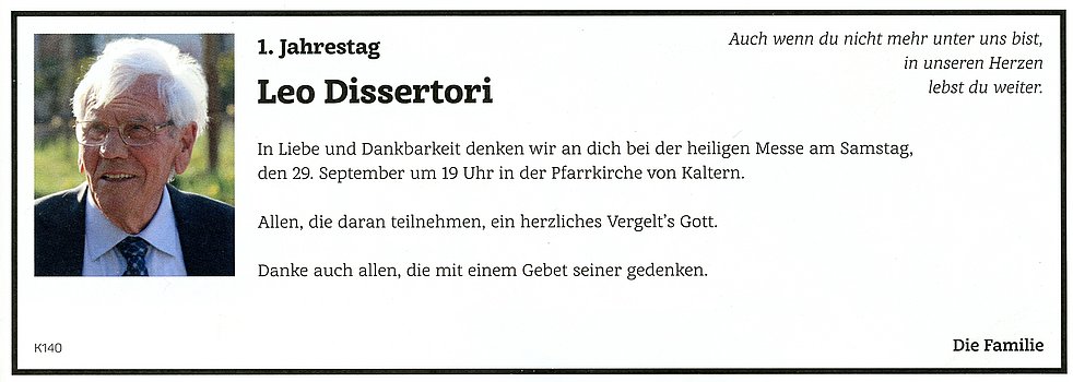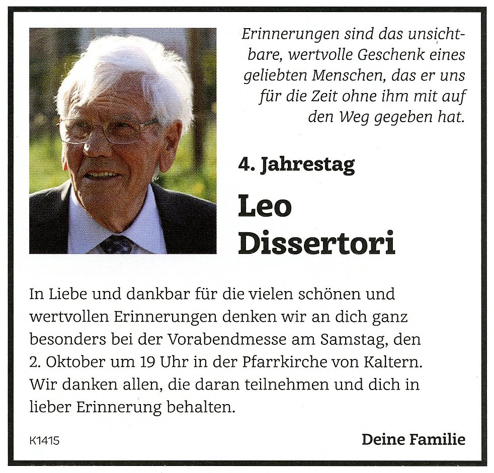Den Begräbnisgottesdienst feiern wir am Samstag, dem 30. September um 14.30 Uhr in der Pfarrkirche von Kaltern. Anschließend begleiten wir unseren lieben Verstorbenen auf den Ortsfriedhof.