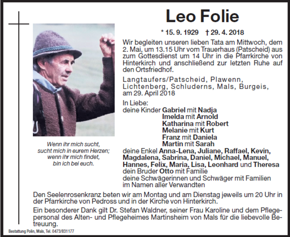 Langtaufers/Patscheid, Plawenn, Lichtenberg, Schluderns, Mals, Burgeis, am 29. April 2018