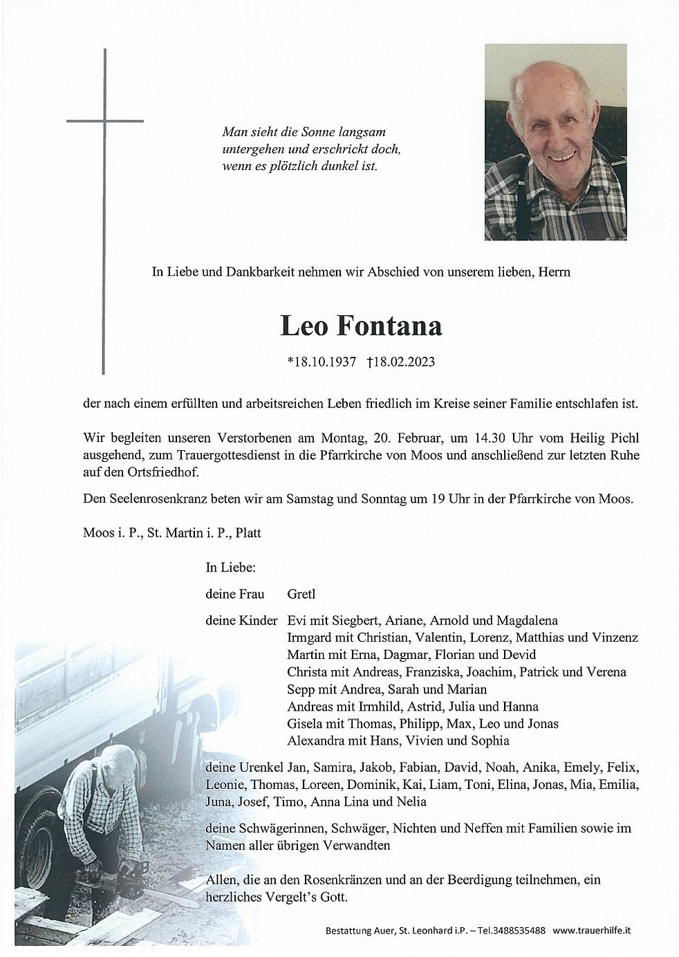 Wir begleiten unseren Verstorbenen am Montag, 20. Februar, um 14.30 Uhr vom Heilig Pichl ausgehend, zum Trauergottesdienst in die Pfarrkirche von Moos und anschließend zur letzten Ruhe auf den Ortsfriedhof.