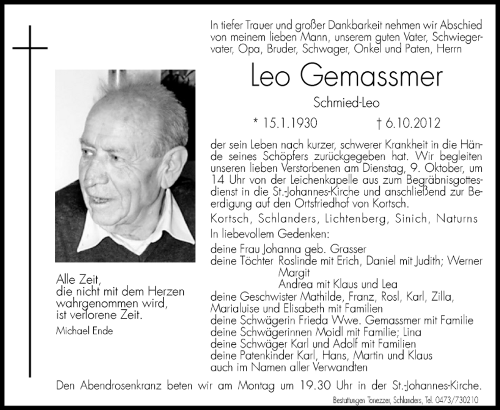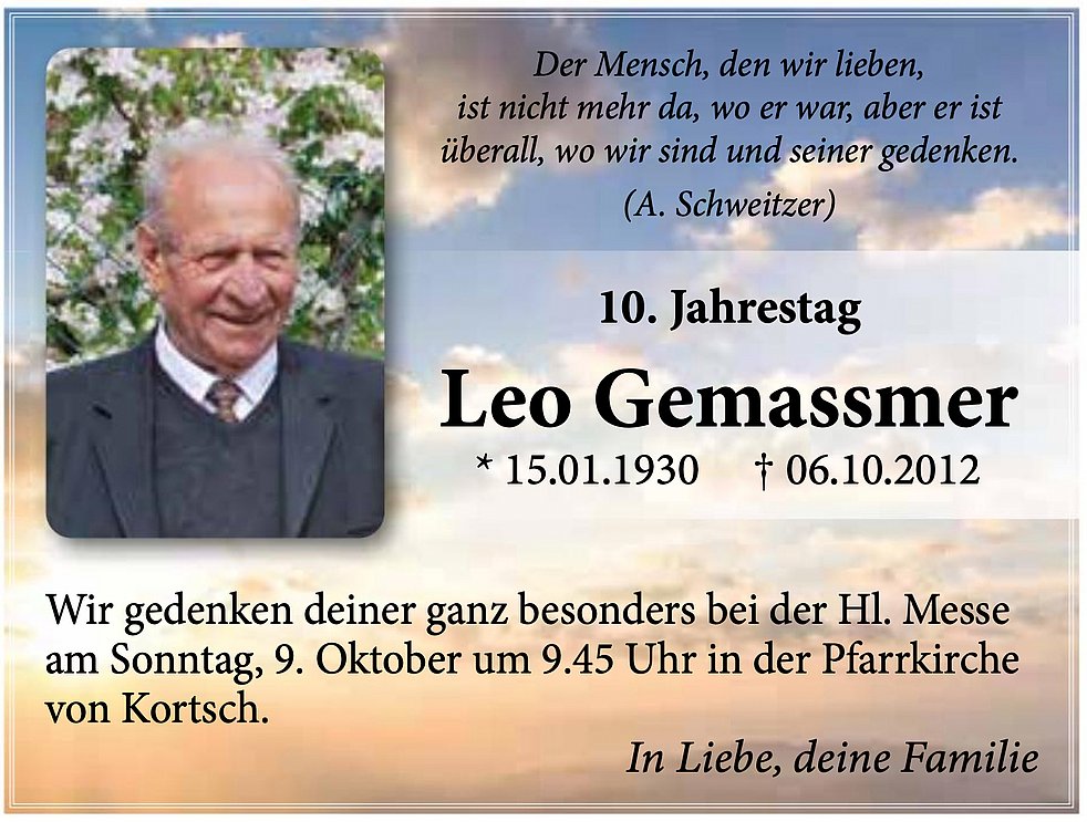 Wir begleiten unseren lieben Verstorbenen am Dienstag, 9. Oktober, um 14 Uhr von der Leichenkapelle aus zum Begräbnisgottesdienst in die St.-Johannes-Kirche und anschließend zur Beerdigung auf den Ortsfriedhof von Kortsch.