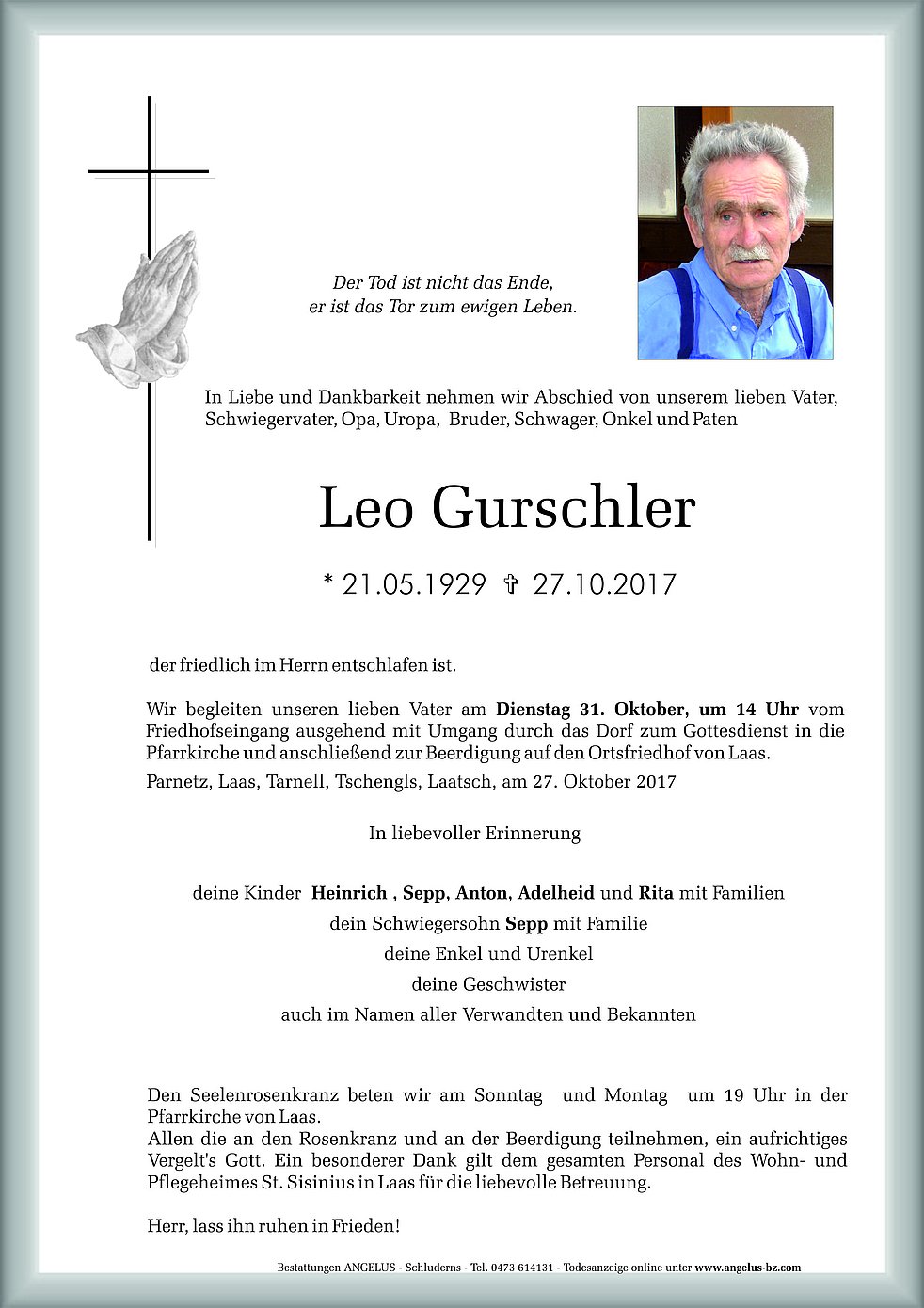 Wir begleiten unseren lieben Vater am Dienstag 31. Oktober, um 14 Uhr vom Friedhofseingang ausgehend mit Umgang durch das Dorf zum Gottesdienst in die Pfarrkirche und anschließend zur Beerdigung auf den Ortsfriedhof von Laas.