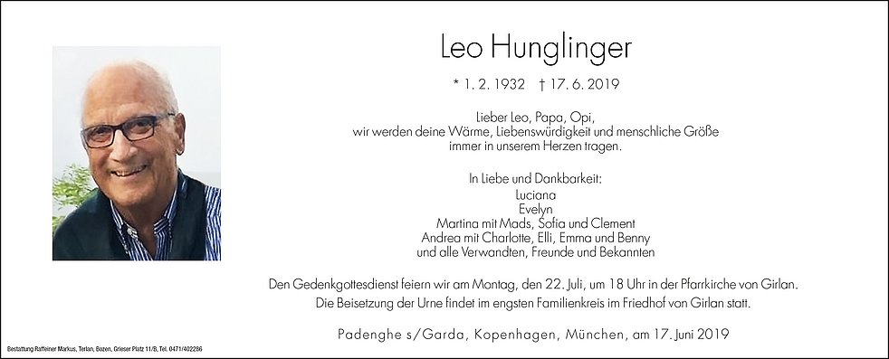 Die Beisetzung der Urne findet im engsten Familienkreis im Friedhof von Girlan statt.