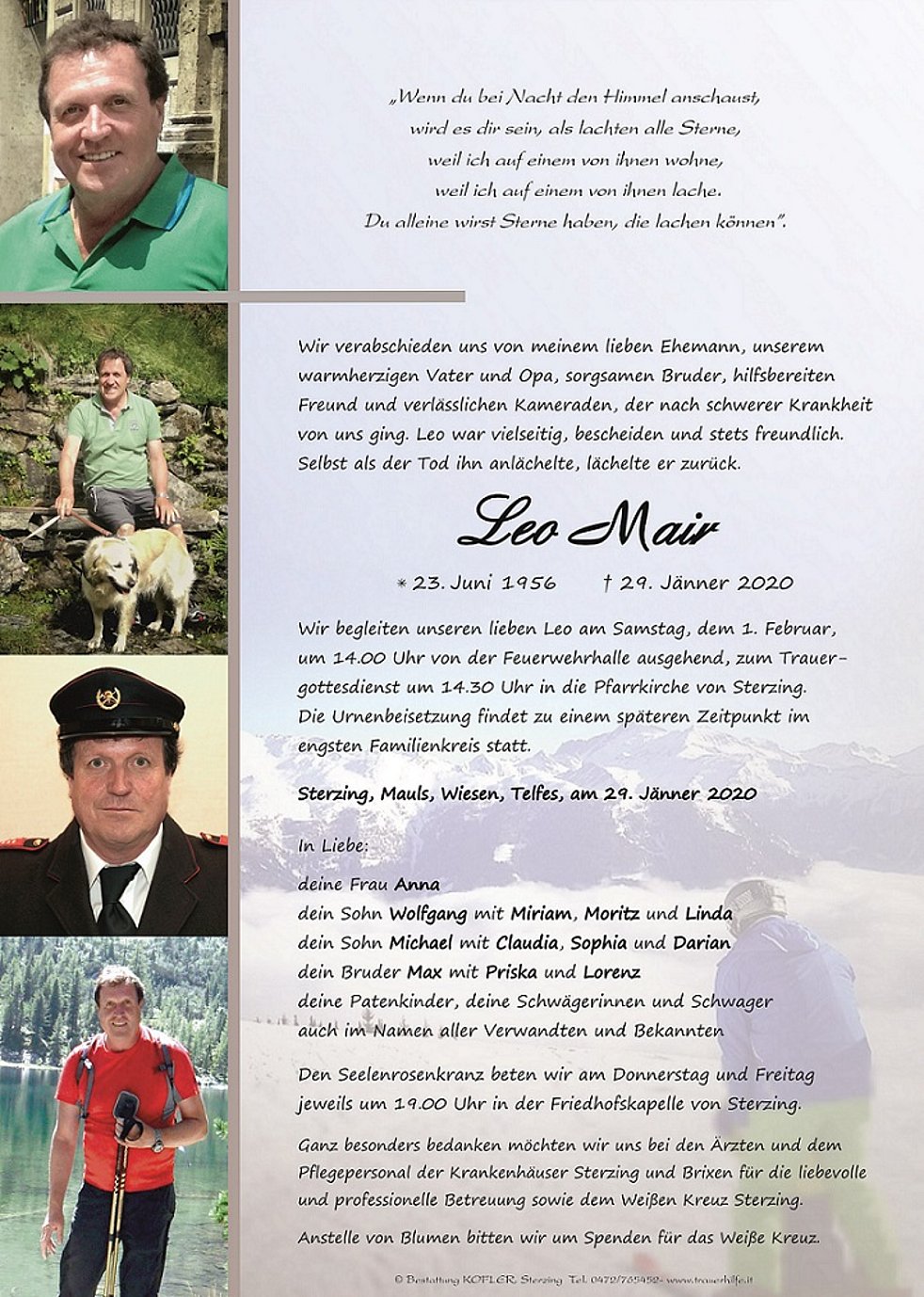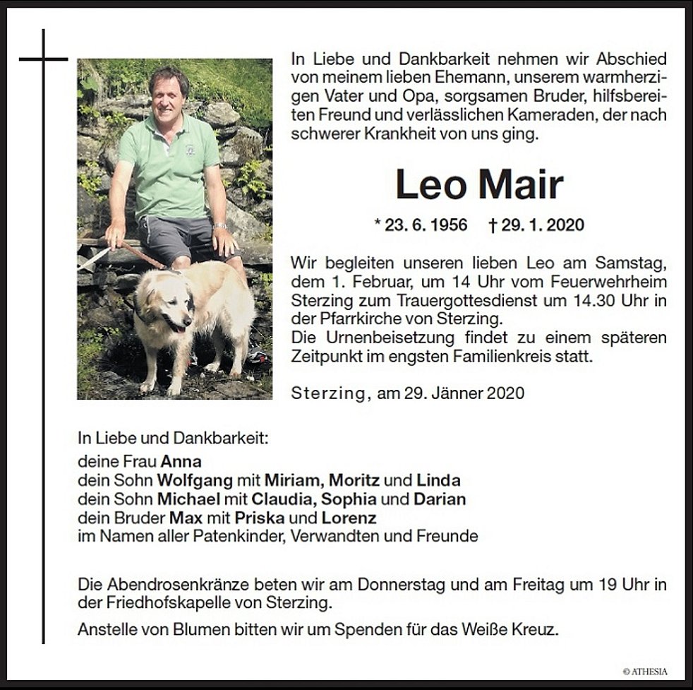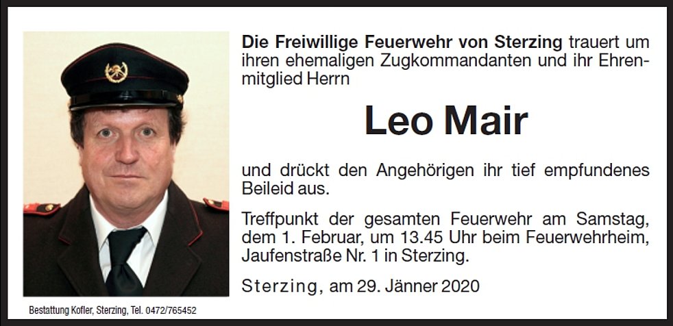 Wir begleiten unseren lieben Leo am Samstag, dem 1. Februar, um 14.00 Uhr von der Feuerwehrhalle ausgehend, zum Trauergottesdienst um 14.30 Uhr in die Pfarrkirche von Sterzing.