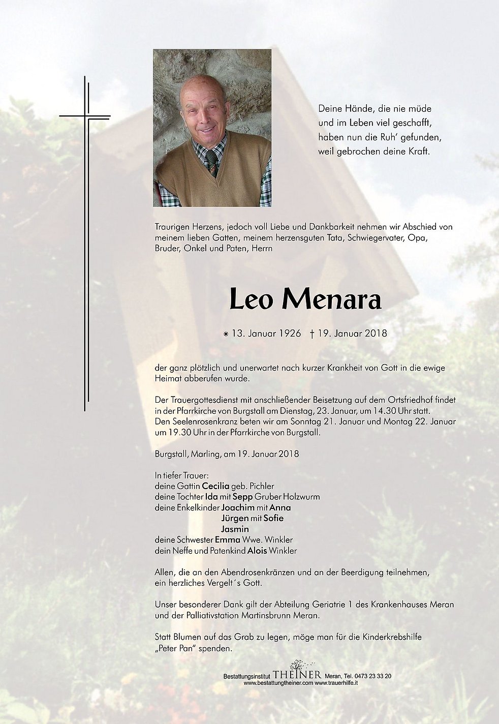 Der Trauergottesdienst mit anschließender Beisetzung auf dem Ortsfriedhof findet in der Pfarrkirche von Burgstall am Dienstag, 23. Januar, um 14.30 Uhr statt.