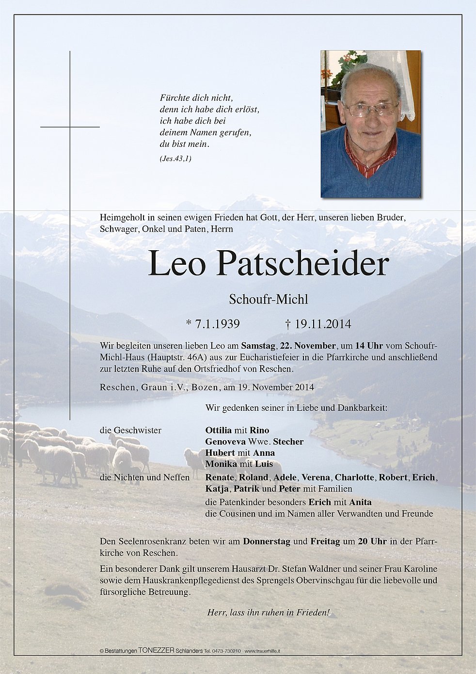 Fürchte dich nicht, denn ich habe dich erlöst, ich habe dich bei deinem Namen gerufen, du bist mein. (Jes.43,1) Heimgeholt in seinen ewigen Frieden hat Gott, der Herr, unseren lieben Bruder, Schwager, Onkel und Paten, Herrn Leo Patscheider Schoufr-Michl * 7.1.1939 † 19.11.2014 Wir begleiten unseren lieben Leo am Samstag, 22. November, um 14 Uhr vom Schoufr-Michl-Haus (Hauptstr. 46A) aus zur Eucharistiefeier in die Pfarrkirche und anschließend zur letzten Ruhe auf den Ortsfriedhof von Reschen. Reschen, Graun i.V., Bozen, am 19. November 2014 Wir gedenken seiner in Liebe und Dankbarkeit: die Geschwister Ottilia mit Rino Genoveva Wwe. Stecher Hubert mit Anna Monika mit Luis die Nichten und Neffen Renate, Roland, Adele, Verena, Charlotte, Robert, Erich, Katja, Patrik und Peter mit Familien die Patenkinder, besonders Erich mit Anita die Cousinen und im Namen aller Verwandten und Freunde Den Seelenrosenkranz beten wir am Donnerstag und Freitag um 20 Uhr in der Pfarrkirche von Reschen. Ein besonderer Dank gilt unserem Hausarzt Dr. Stefan Waldner und seiner Frau Karoline sowie dem Hauskrankenpflegedienst des Sprengels Obervinschgau für die liebevolle und fürsorgliche Betreuung. Herr, lass ihn ruhen in Frieden!