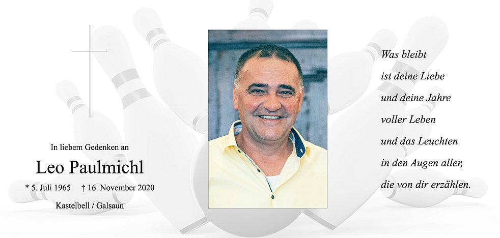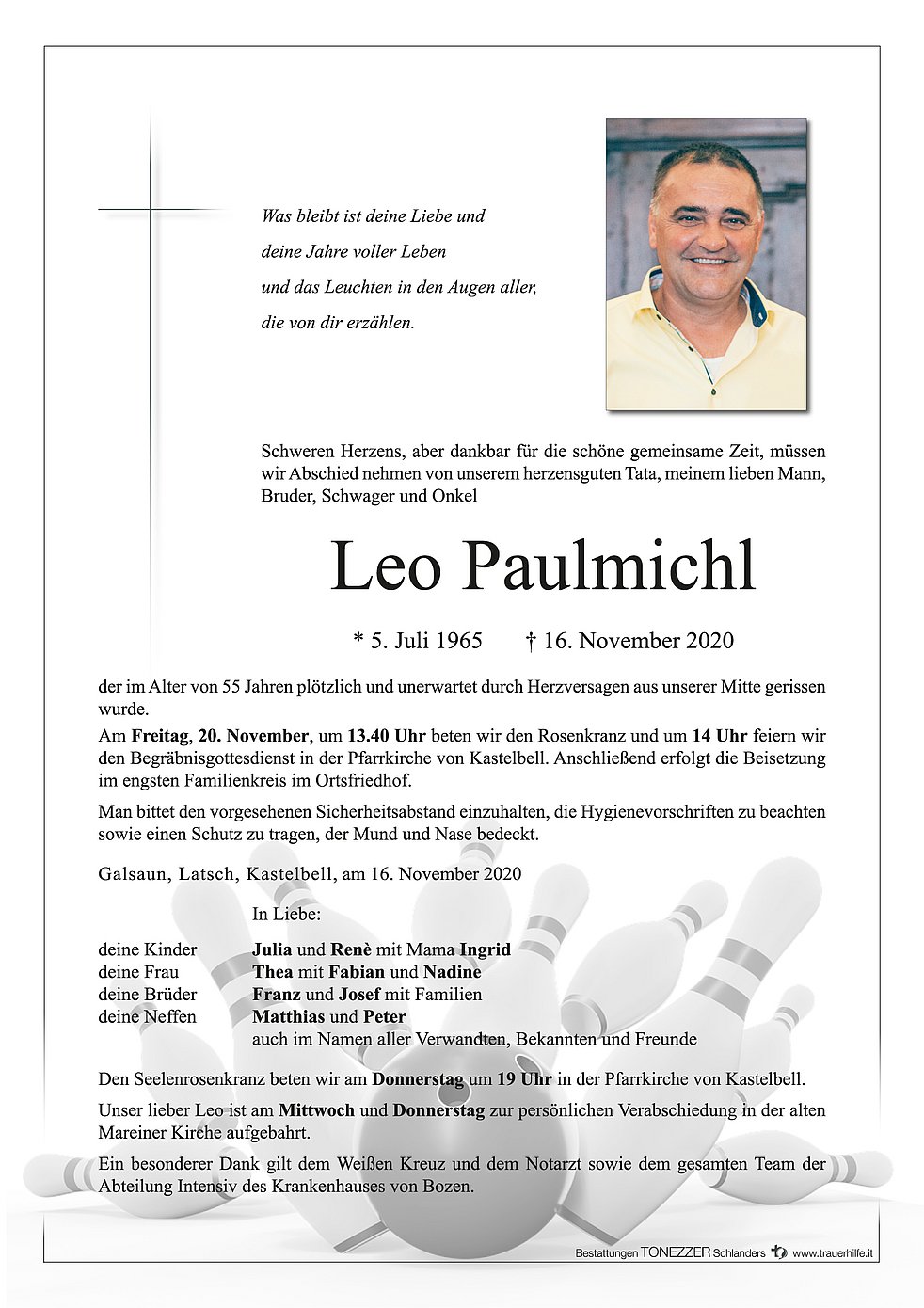 Am Freitag, 20. November, um 13.40 Uhr beten wir den Rosenkranz und um 14 Uhr feiern wir den Begräbnisgottesdienst in der Pfarrkirche von Kastelbell.