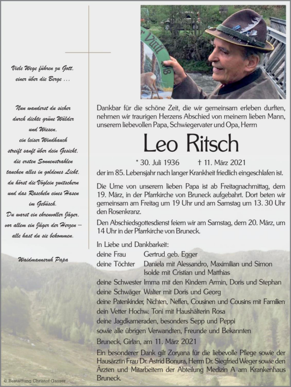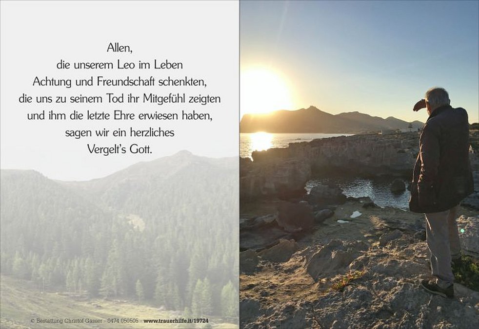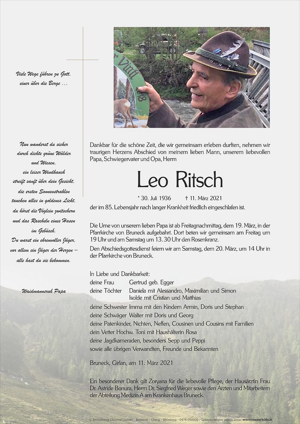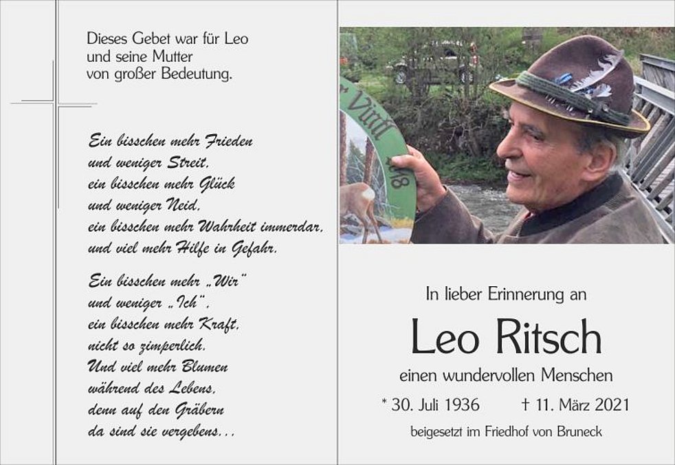 Die Urne von unserem lieben Papa ist ab Freitagnachmittag, dem 19. März, in der Pfarrkirche von Bruneck aufgebahrt. Dort beten wir gemeinsam am Freitag um 19 Uhr und am Samstag um 13. 30 Uhr den Rosenkranz.