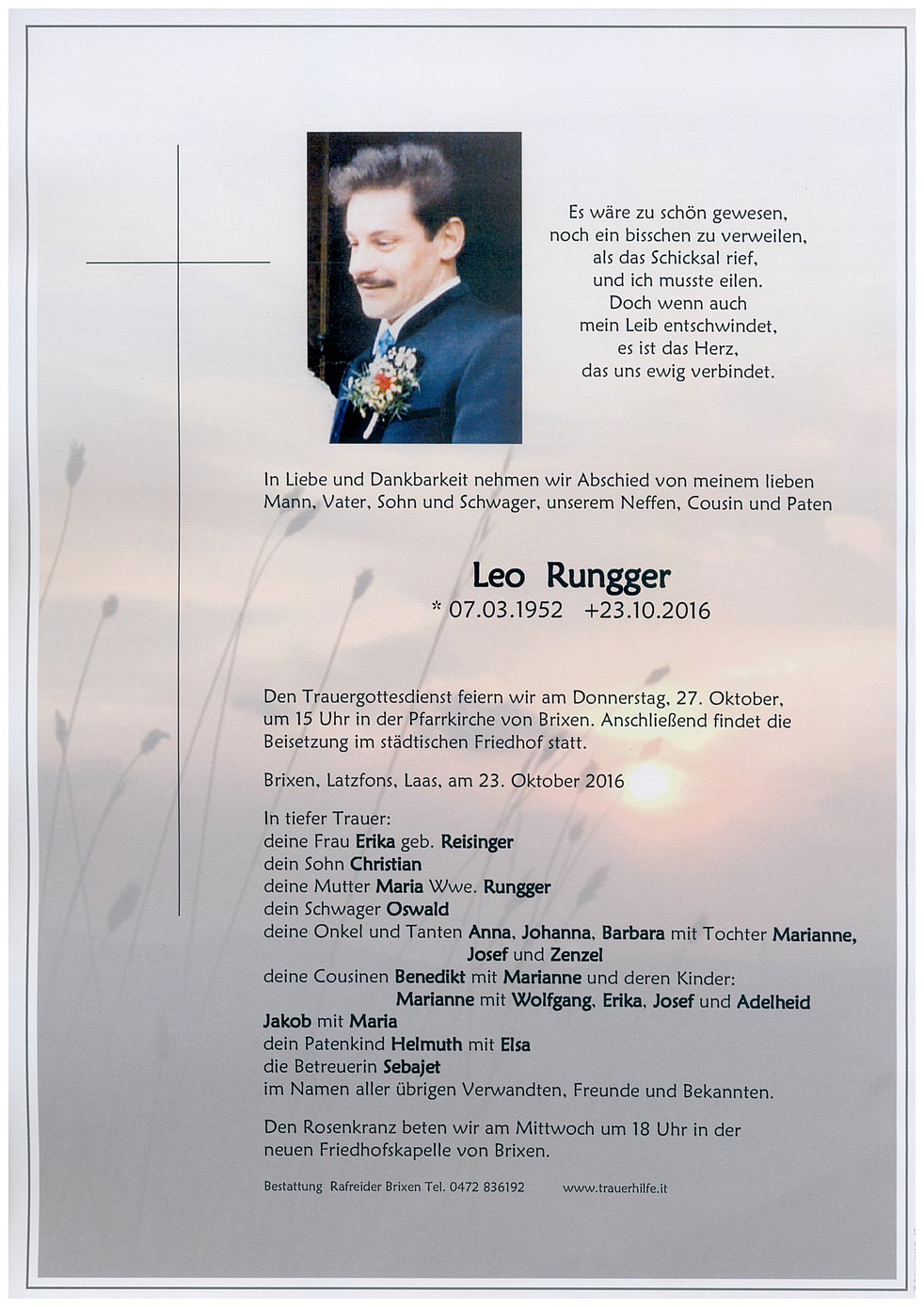 Gedankt sei dem Hausarzt Dr. Bruno Letrari, den Ärzten und dem Pflegepersonal der Abteilung Medizin Ost des Brixner Krankenhauses, dem Pflegepersonal des Pflegeheimes Sanatorium 1. Wohnbereich, sowie dem Hauspflegedienst für die liebevolle Betreuung und allen die am Rosenkranz und an der Beerdigung teilnehmen.