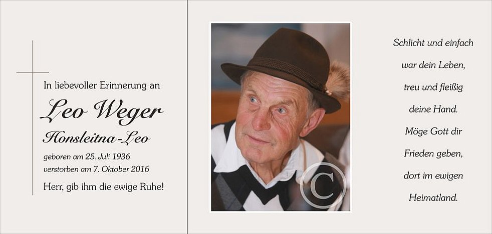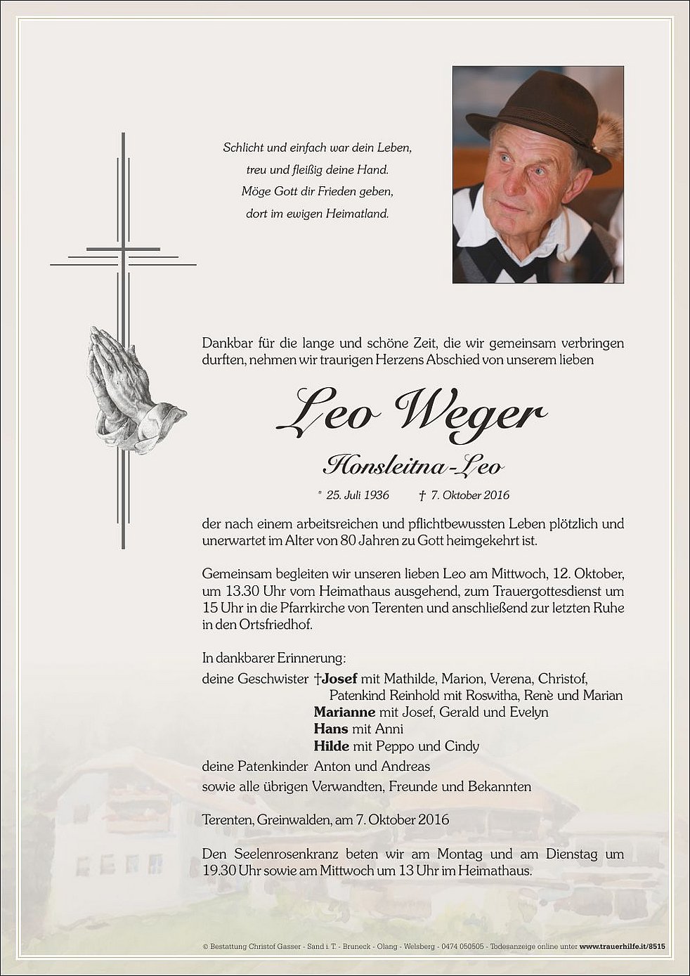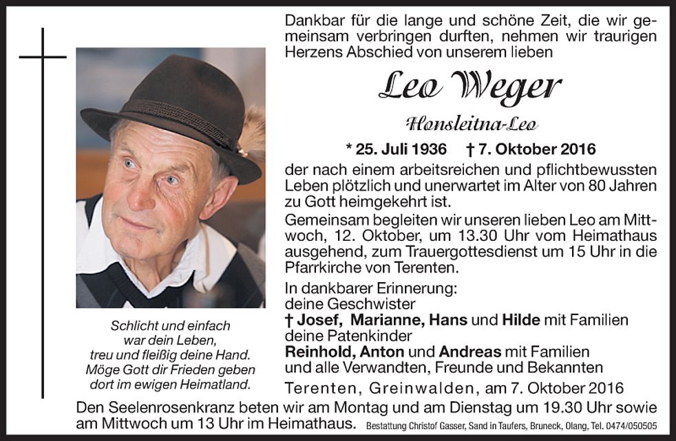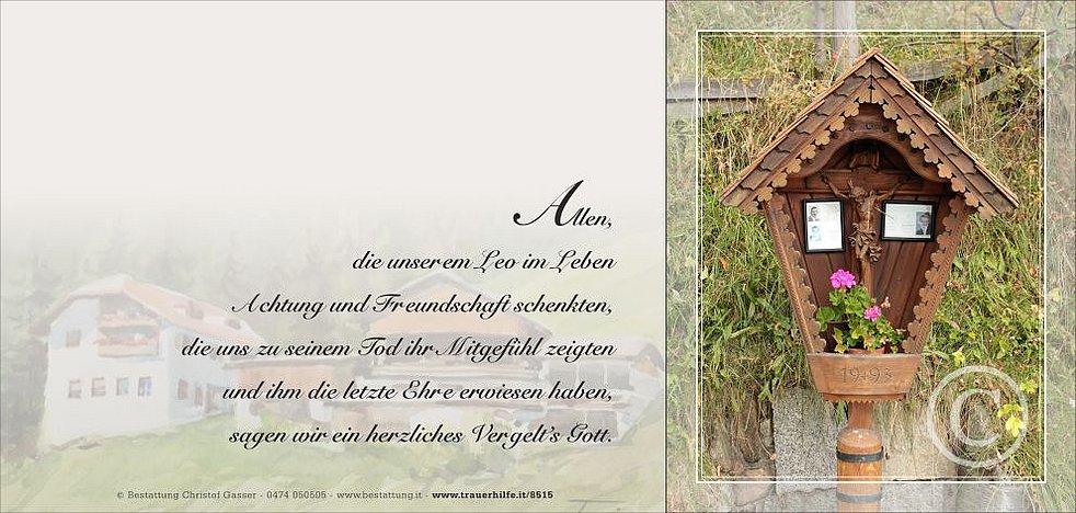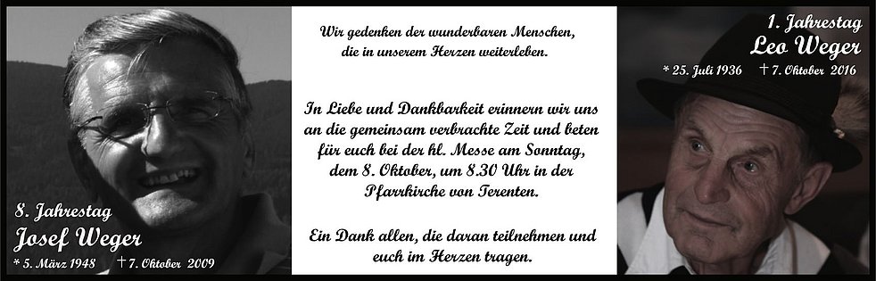 Gemeinsam begleiten wir unseren lieben Leo am Mittwoch, 12. Oktober, um 13.30 Uhr vom Heimathaus ausgehend, zum Trauergottesdienst um 15 Uhr in die Pfarrkirche von Terenten und anschließend zur letzten Ruhe in den Ortsfriedhof.