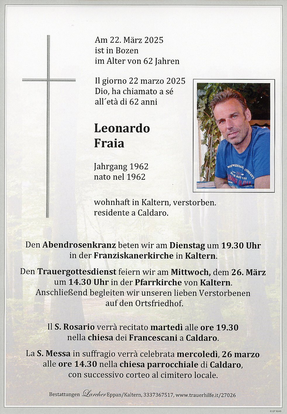 Den Trauergottesdienst feiern wir am Mittwoch, dem 26. März um 14.30 Uhr in der Pfarrkirche von Kaltern. Anschließend begleiten wir unseren lieben Verstorbenen auf den Ortsfriedhof.