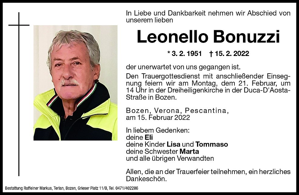Den Trauergottesdienst mit anschließender Einsegnung feiern wir am Montag, dem 21. Februar, um 14 Uhr in der Dreiheiligenkirche Duca D‘Aosta Strasse in Bozen.