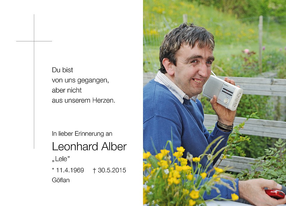 Wir begleiten unseren lieben Leonhard am Dienstag, 2. Juni, um 14 Uhr vom Trauerhaus aus zum Begräbnisgottesdienst in die St. Martin-Kirche und anschließend zur Verabschiedung auf den Ortsfriedhof von Göflan.