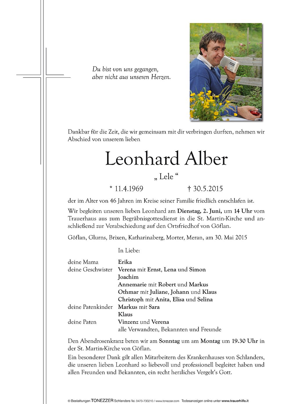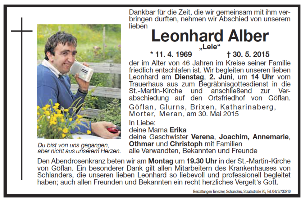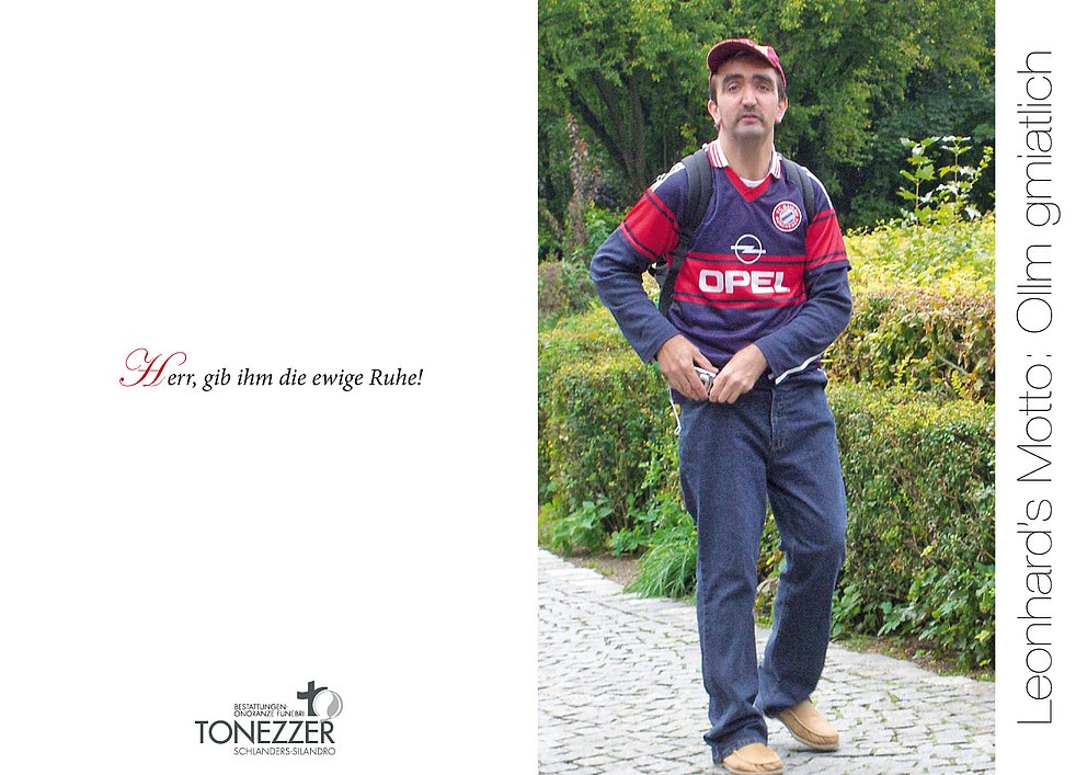 Ein besonderer Dank gilt allen Mitarbeitern des Krankenhauses von Schlanders, die unseren lieben Leonhard so liebevoll und professionell begleitet haben und allen Freunden und Bekannten, ein recht herzliches Vergelt‘s Gott.
