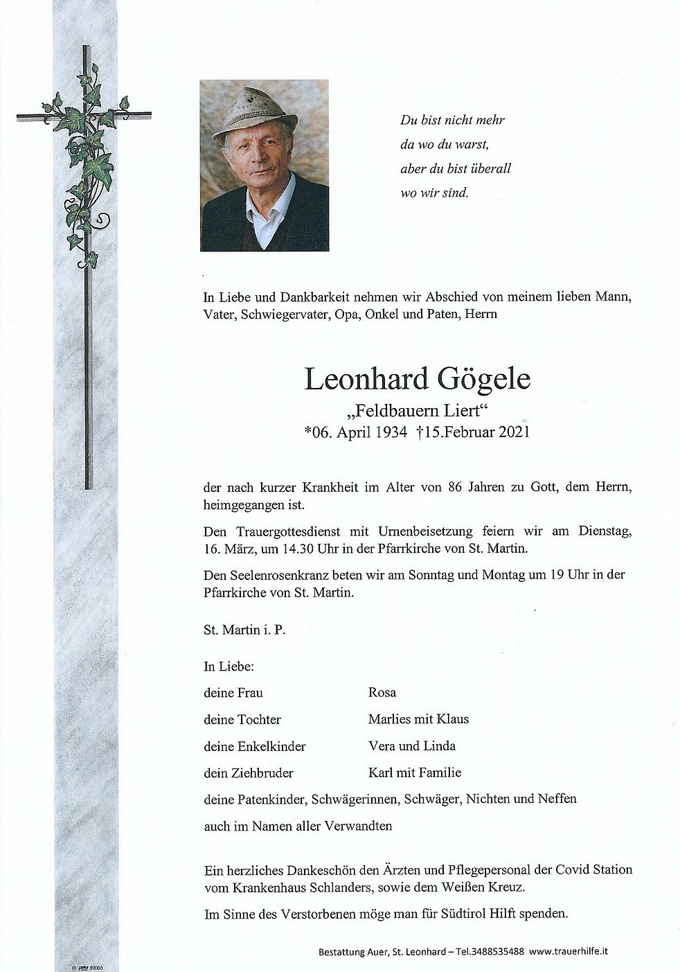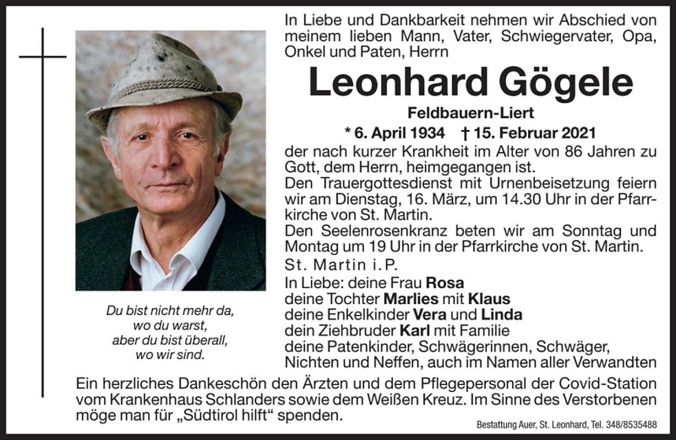 Im Sinne des Verstorbenen möge man für Südtirol Hilft spenden.