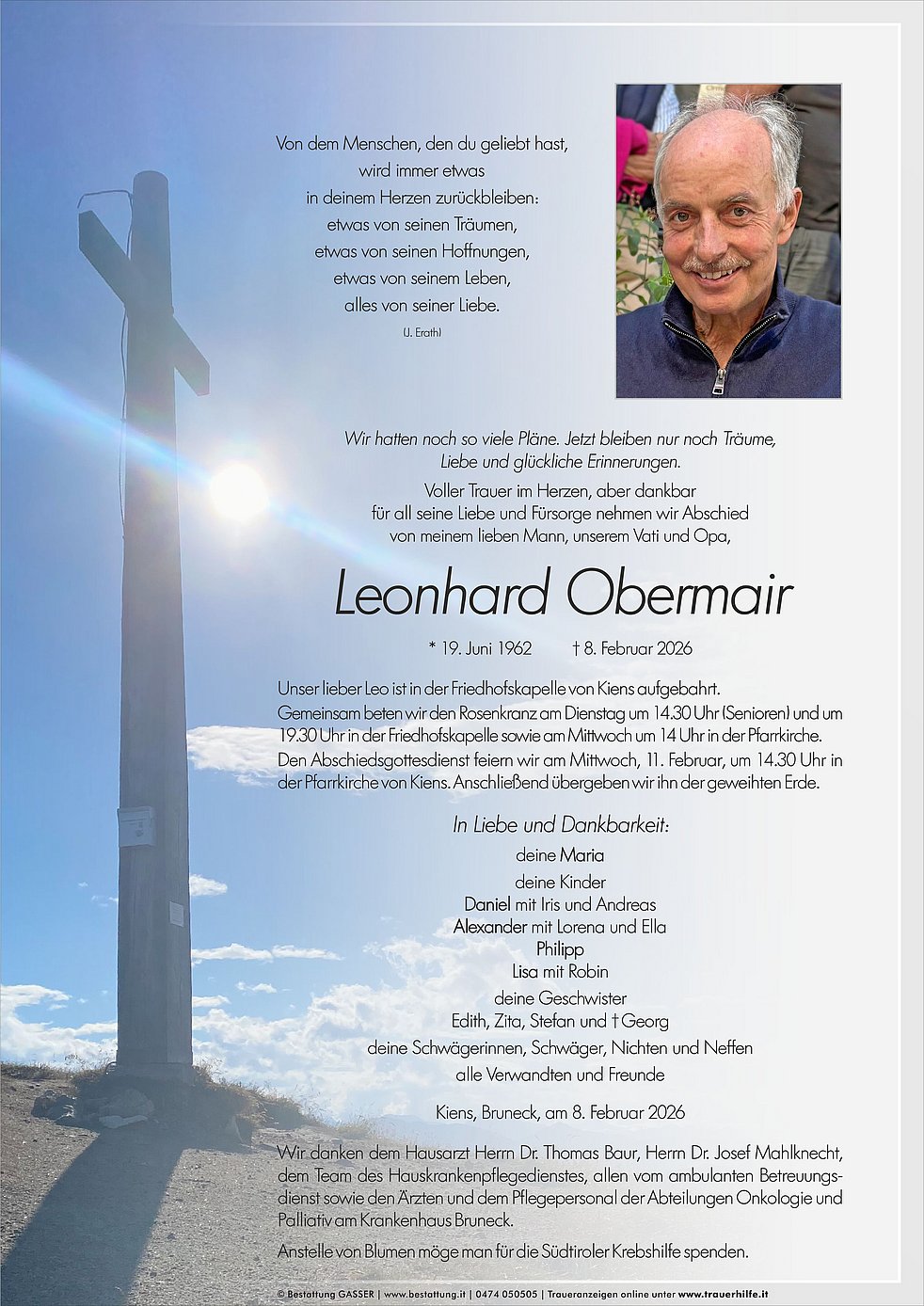 Den Abschiedsgottesdienst feiern wir am Mittwoch, 11. Februar, um 14.30 Uhr in der Pfarrkirche von Kiens. Anschließend übergeben wir ihn der geweihten Erde.