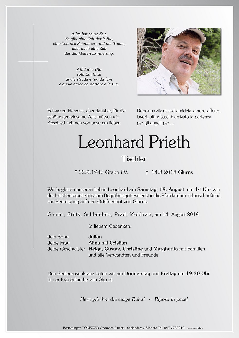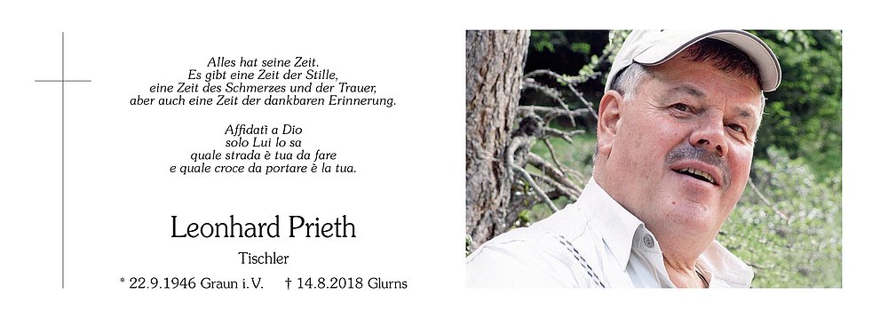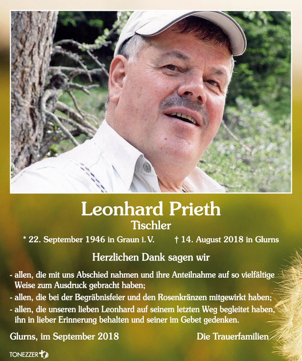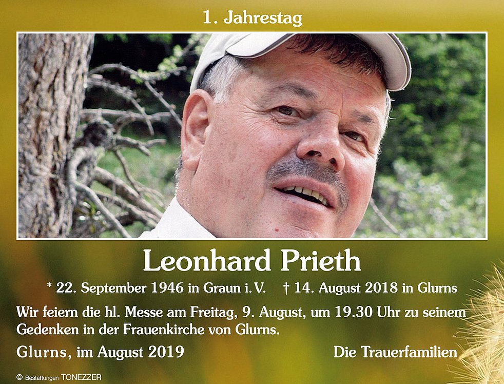 Wir begleiten unseren lieben Leonhard am Samstag, 18. August, um 14 Uhr von der Leichenkapelle aus zum Begräbnisgottesdienst in die Pfarrkirche und anschließend zur Beerdigung auf den Ortsfriedhof von Glurns.