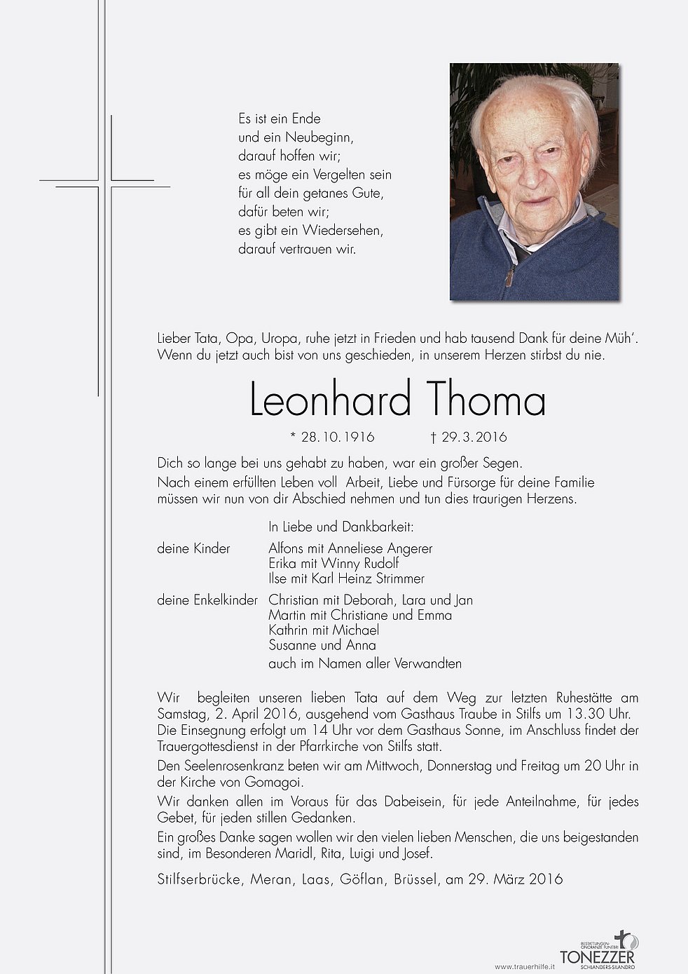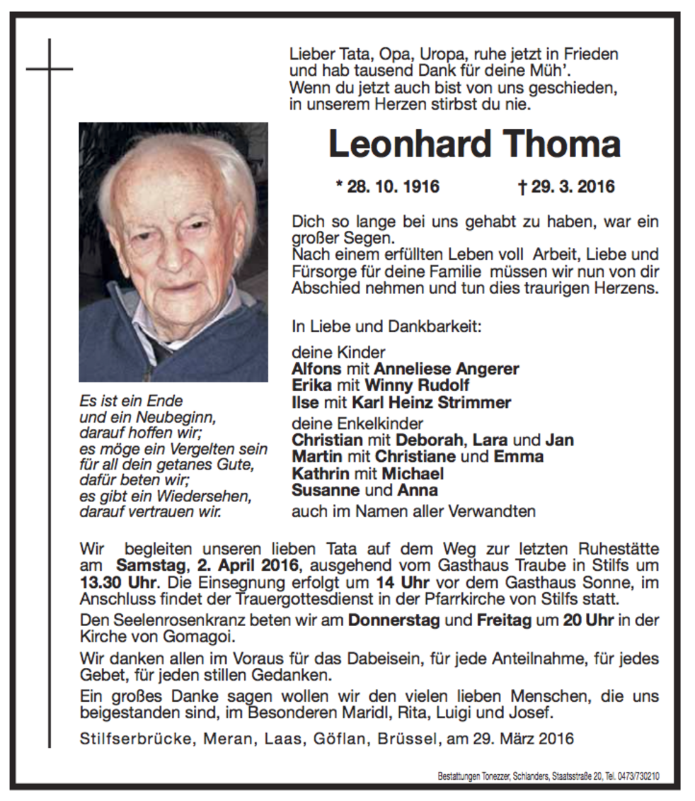 Wir begleiten unseren lieben Tata auf dem Weg zur letzten Ruhestätte am Samstag, 2. April 2016, ausgehend vom Gasthaus Traube in Stilfs um 13.30 Uhr.