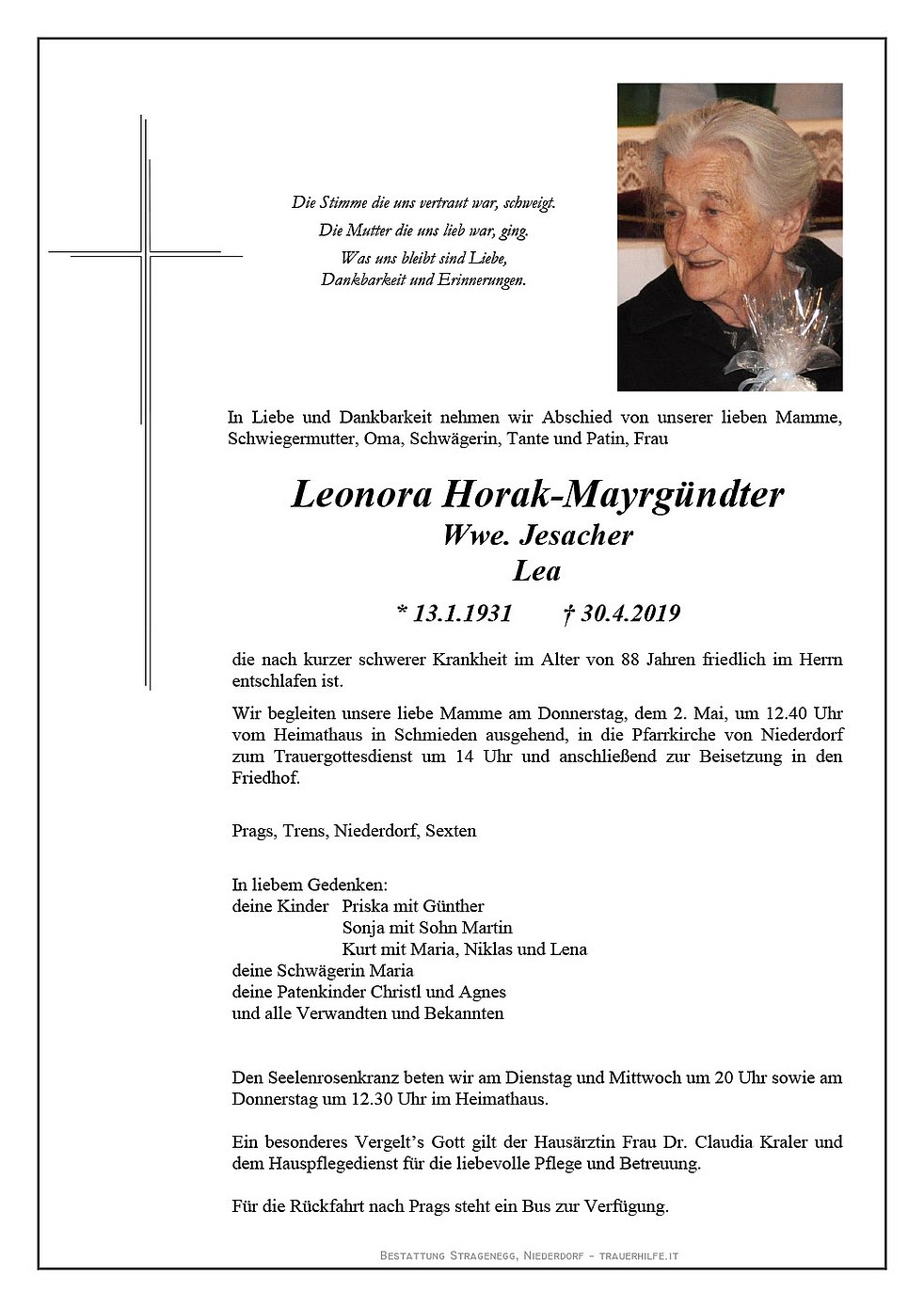 Wir begleiten unsere liebe Mamme am Donnerstag, dem 2. Mai, um 12.40 Uhr vom Heimathaus in Schmieden ausgehend, in die Pfarrkirche von Niederdorf zum Trauergottesdienst um 14 Uhr und anschließend zur Beisetzung in den Friedhof.
