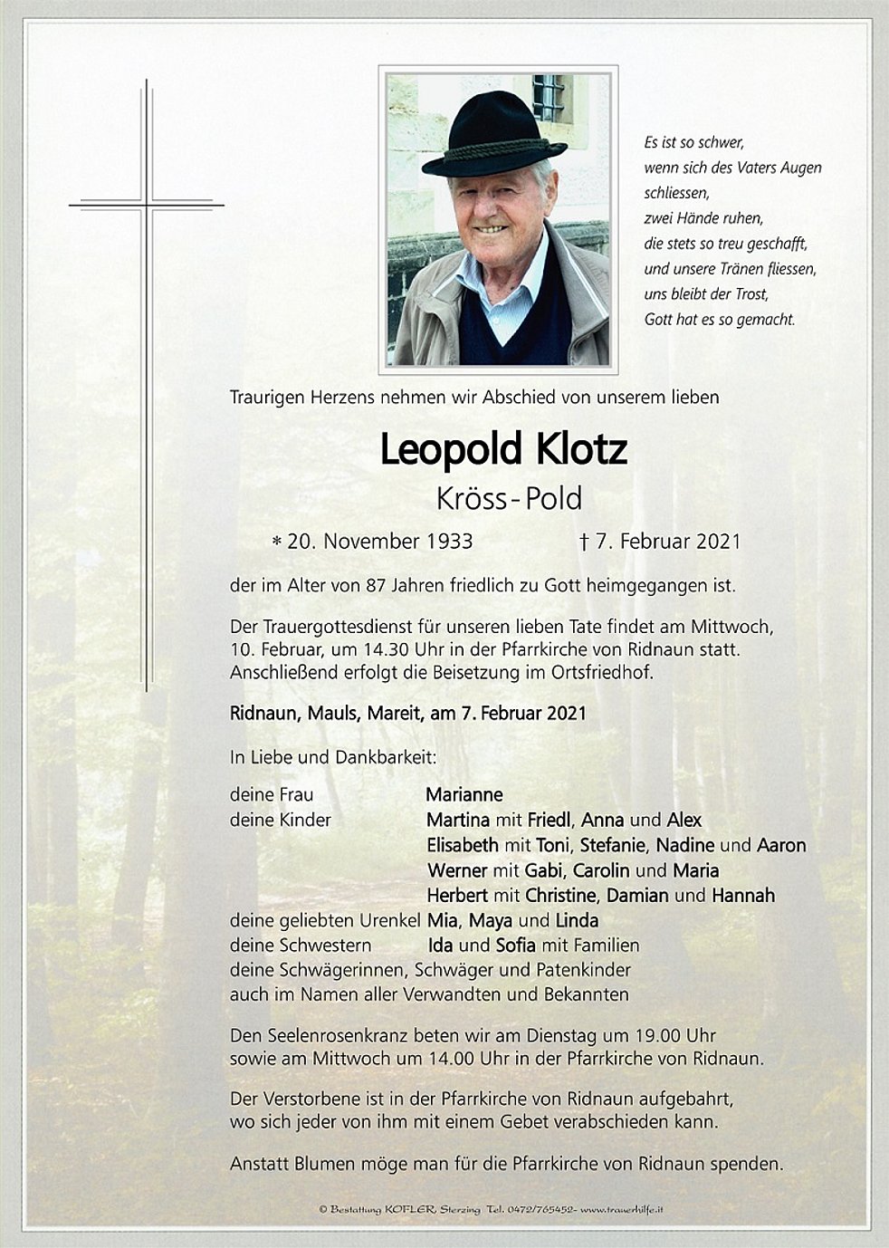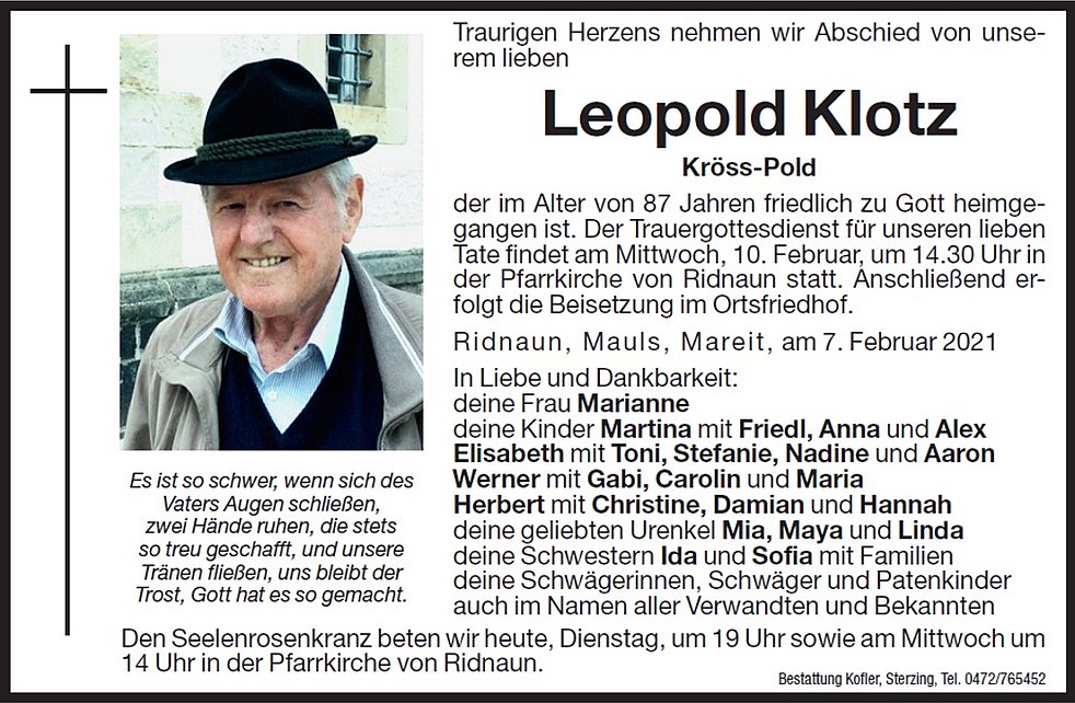 Der Trauergottesdienst für unseren lieben Tate findet am Mittwoch, 10. Februar, um 14.30 Uhr in der Pfarrkirche von Ridnaun statt. Anschließend erfolgt die Beisetzung im Ortsfriedhof.