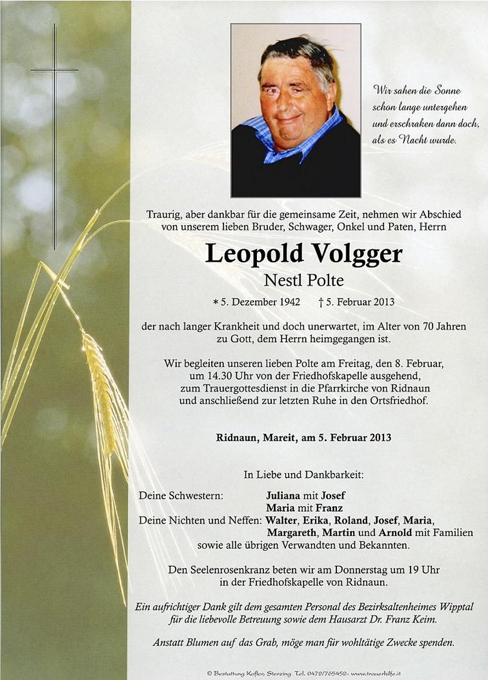 von Ridnaun und anschließend zur letzten Ruhe in den Ortsfriedhof.