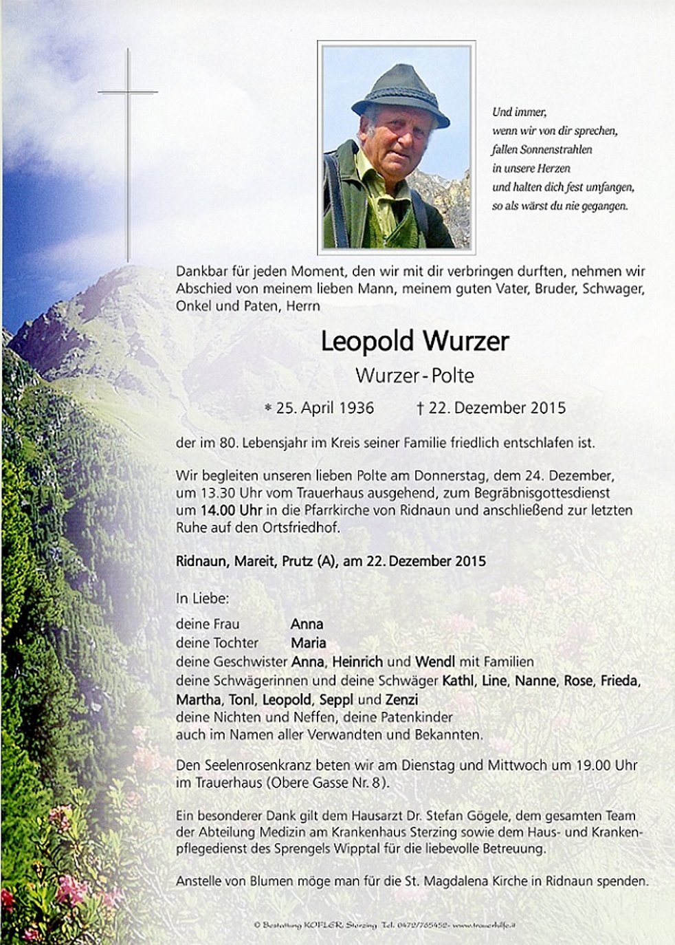 Anstelle von Blumen möge man für die St. Magdalena Kirche in Ridnaun spenden.