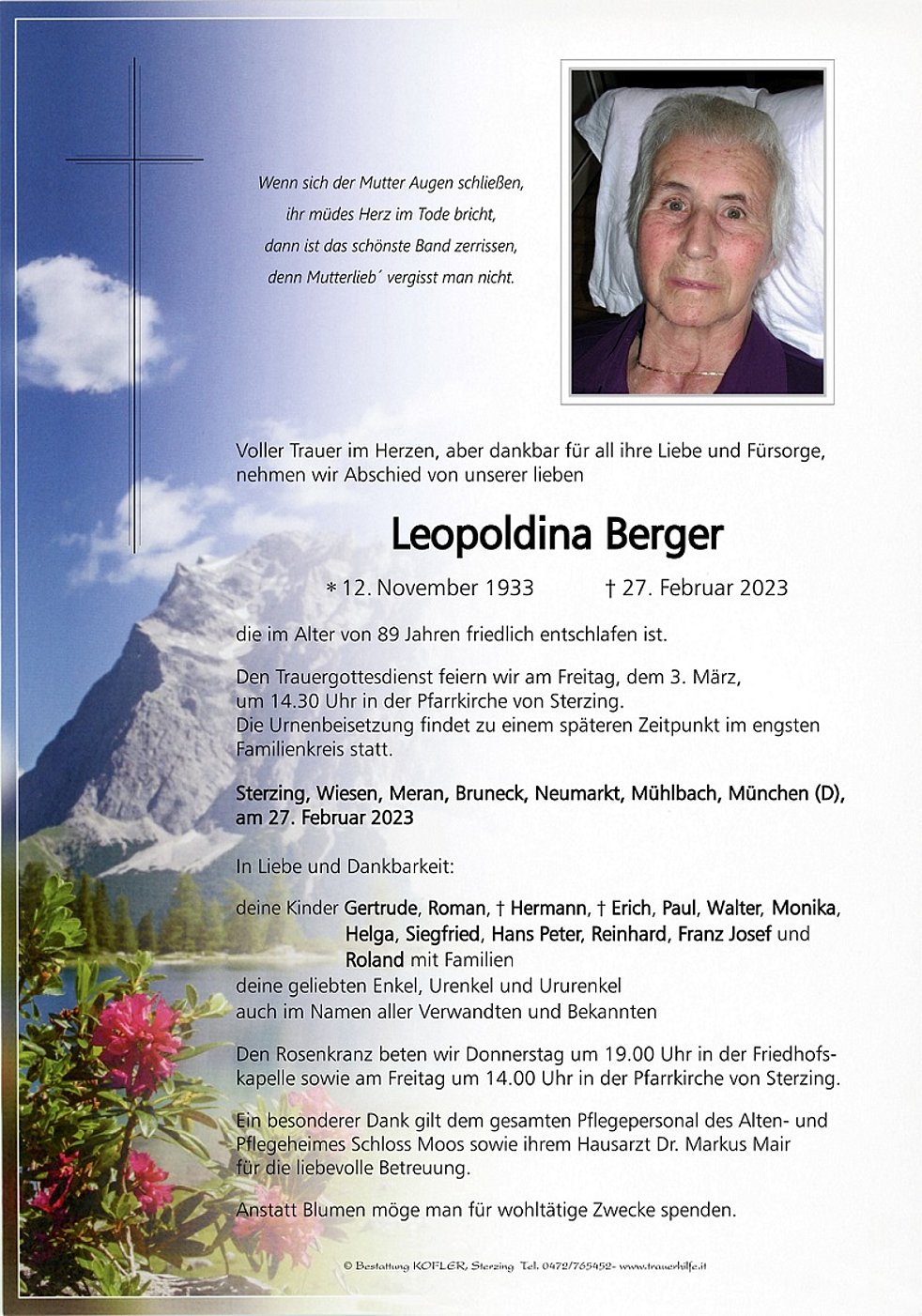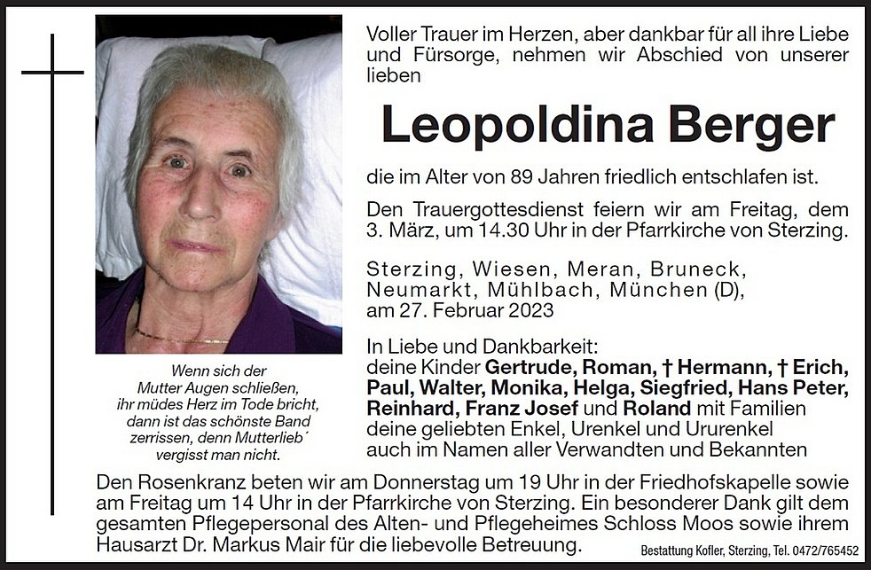 Den Trauergottesdienst feiern wir am Freitag, dem 3. März, um 14.30 Uhr in der Pfarrkirche von Sterzing. Die Urnenbeisetzung findet zu einem späteren Zeitpunkt im engsten Familienkreis statt.