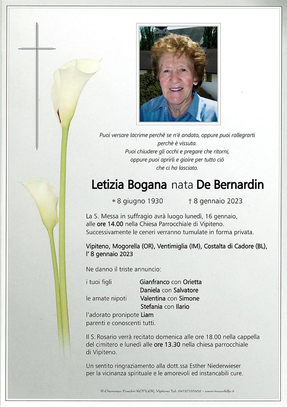 La S. Messa in suffragio avrà luogo lunedì, 16 gennaio, alle ore 14.00 nella Chiesa Parrocchiale di Vipiteno. Successivamente le ceneri verranno tumulate in forma privata.