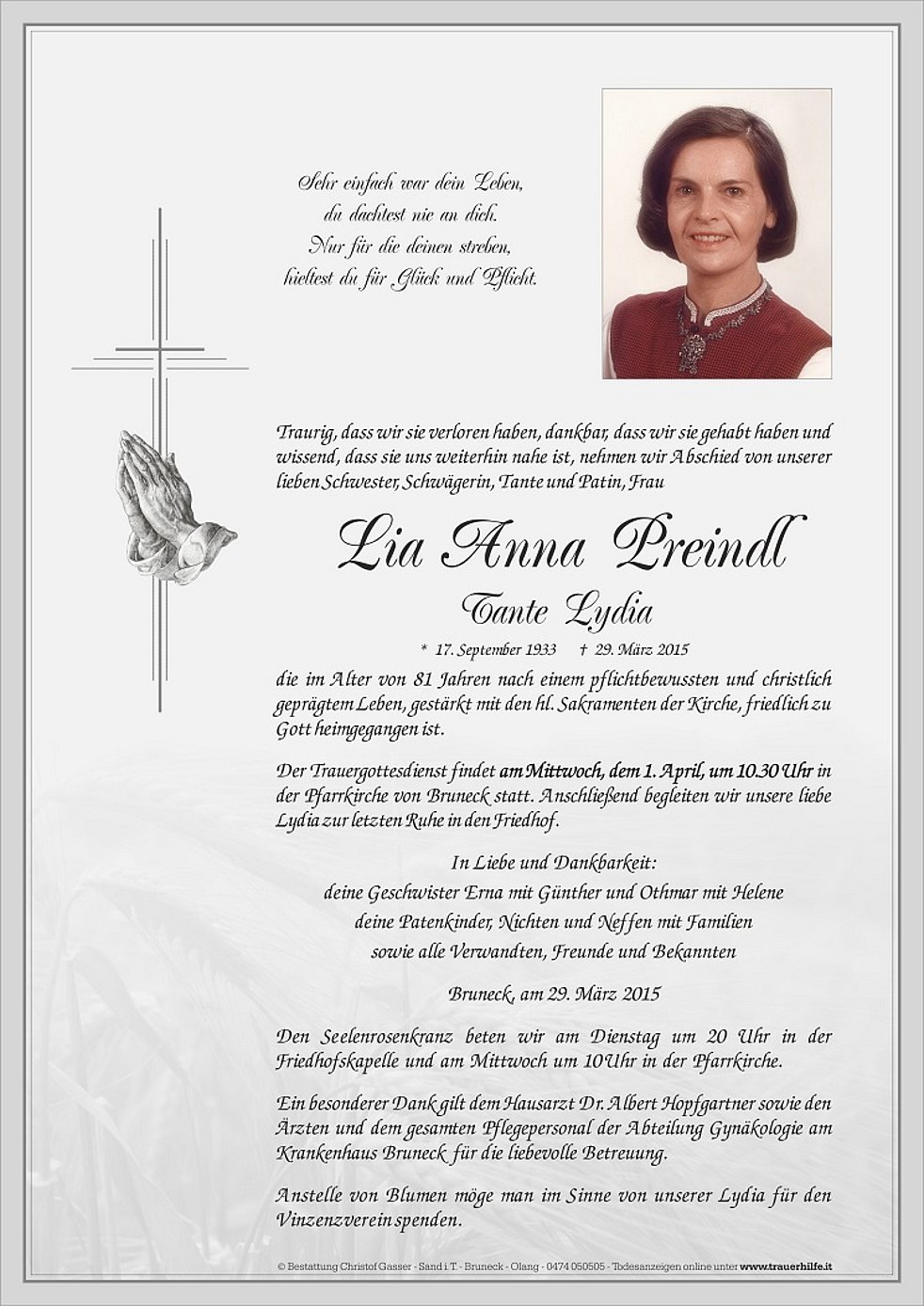 Der Trauergottesdienst findet am Mittwoch, dem 1. April, um 10.30 Uhr in der Pfarrkirche von Bruneck statt. Anschließend begleiten wir unsere liebe Lydia zur letzten Ruhe in den Friedhof.