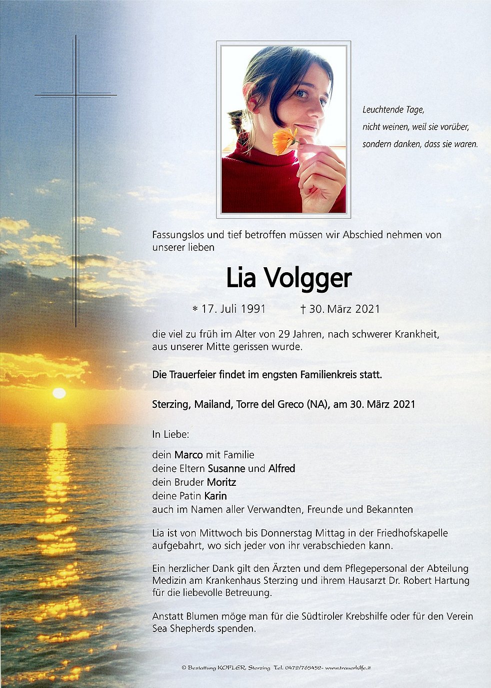 Anstatt Blumen möge man für die Südtiroler Krebshilfe oder für den Verein Sea Shepherds spenden.