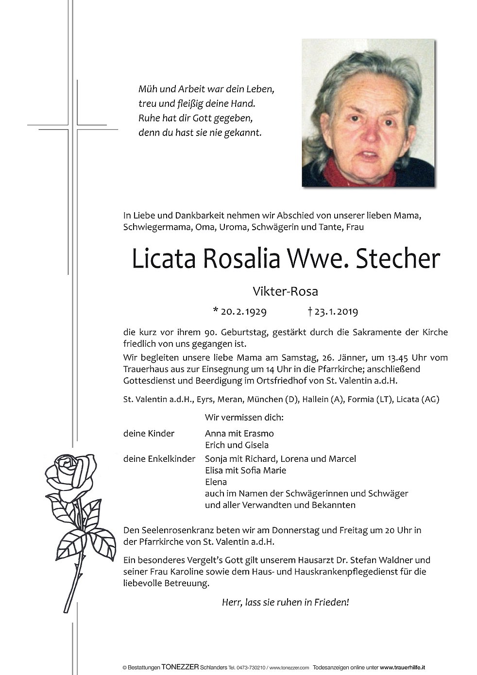Wir begleiten unsere liebe Mama am Samstag, 26. Jänner, um 13.45 Uhr vom Trauerhaus aus zur Einsegnung um 14 Uhr in die Pfarrkirche; anschließend Gottesdienst und Beerdigung im Ortsfriedhof von St. Valentin a.d.H.