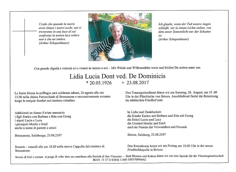 Den Trauergottesdienst feiern wir am Samstag, 26. August, um 15 .00 Uhr in der Pfarrkirche von Brixen. Anschließend findet die Beisetzung im städtischen Friedhof statt.