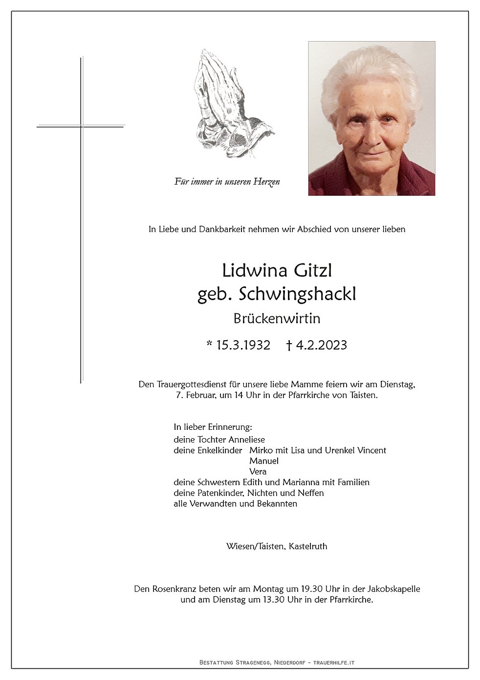Den Trauergottesdienst für unsere liebe Mamme feiern wir am Dienstag, 7. Februar, um 14 Uhr in der Pfarrkirche von Taisten.