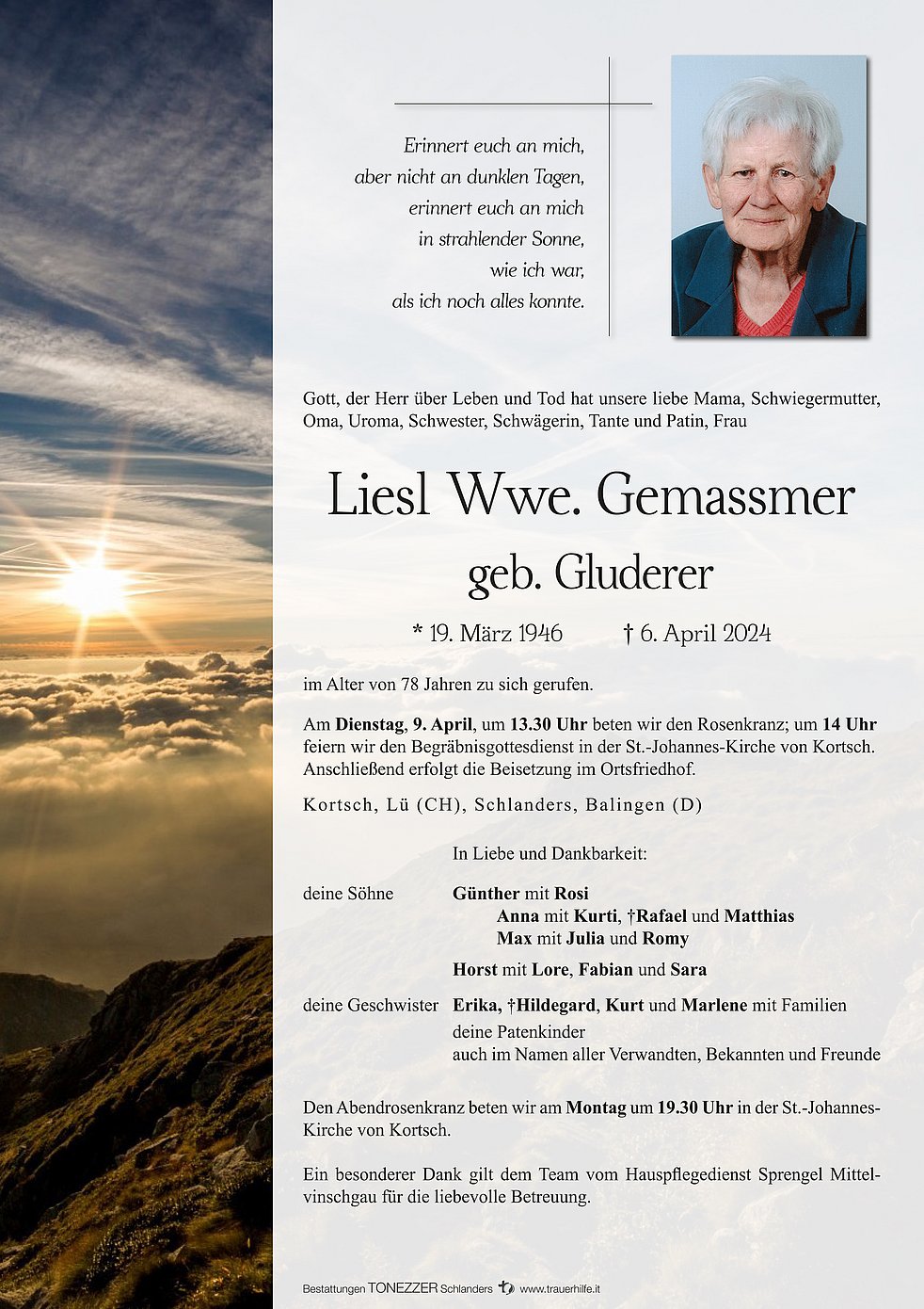 Nur in letzter Zeit hat sie gefehlt in Schlanders, die Liesl aus Kortsch. Freundlich, fröhlich und gesellig, so hat man sie gekannt. Als Jahrgangskollege verbinden mich unterhaltsame Abende und ihr Einsatz über Jahrzehnte. Für alles sei dir gedankt, liebe Liesl und ich werde dich in guter Erinnerung behalten.
