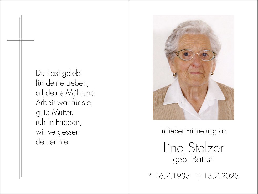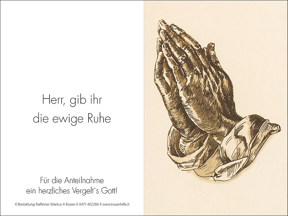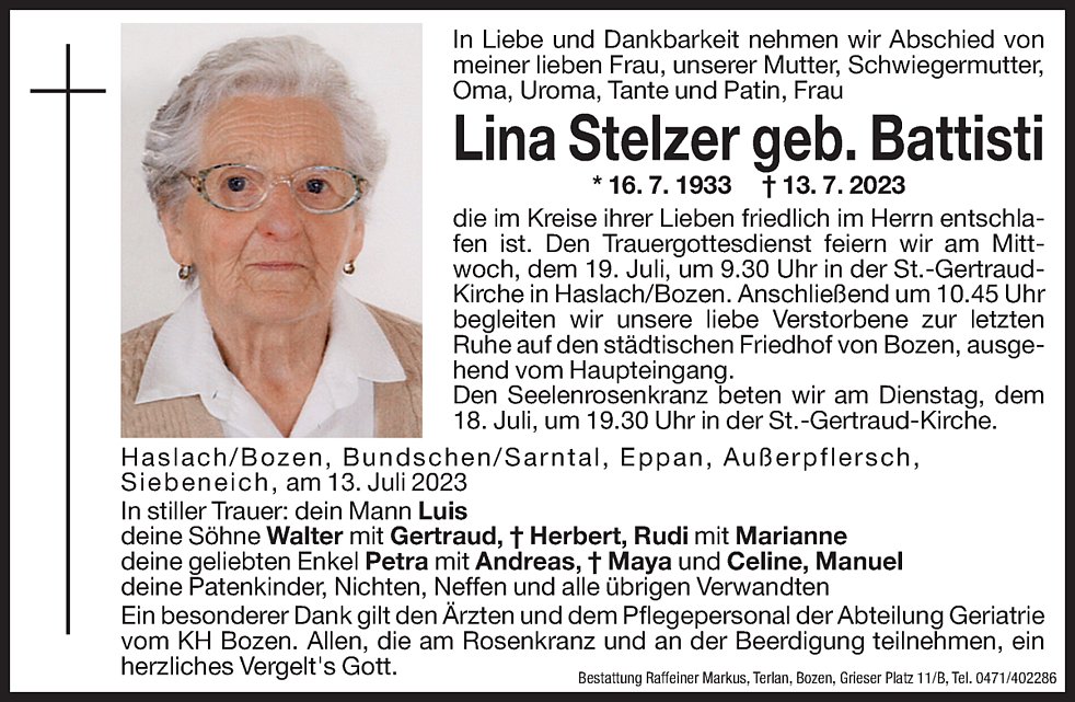 Den Trauergottesdienst feiern wir am Mittwoch, dem 19. Juli, um 9.30 Uhr in der St. Gertraud-Kirche in Haslach/Bozen. Anschließend um 10.45 Uhr begleiten wir unsere liebe Verstorbene zur letzten Ruhe auf den städtischen Friedhof von Bozen, ausgehend vom Haupteingang.
