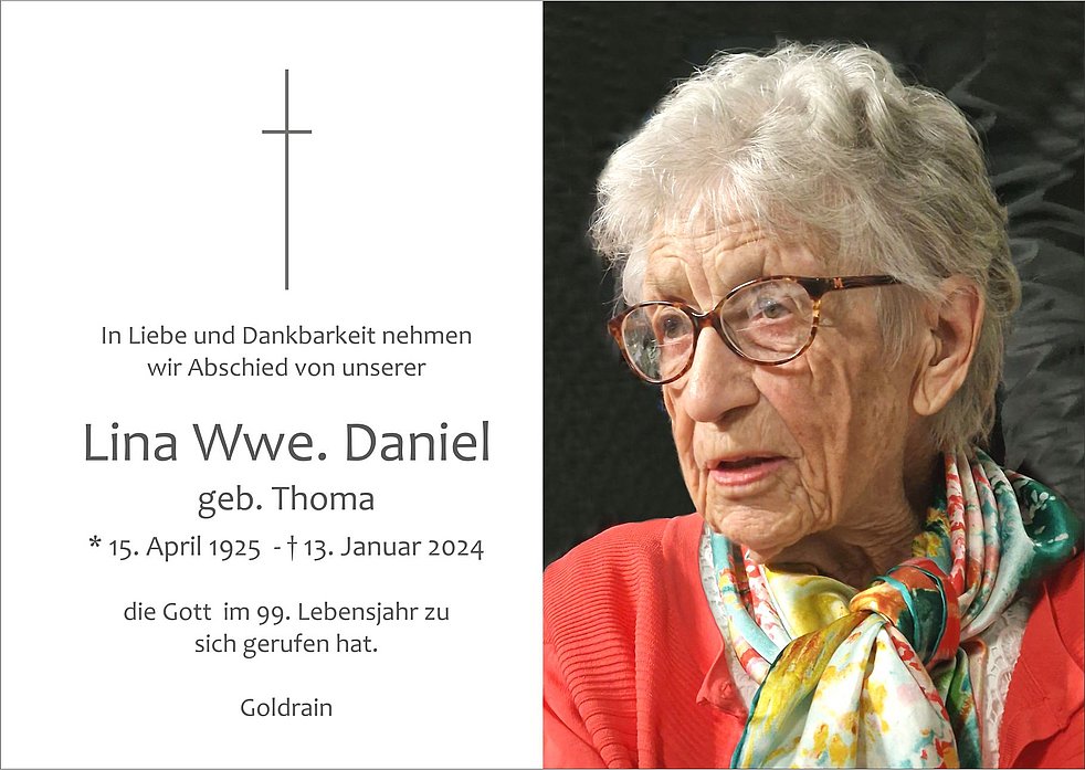 Am Mittwoch, den 17. Januar beten wir um 13.30 Uhr den Rosenkranz und feiern um 14.00 Uhr den Trauergottesdienst mit anschließender Einsegnung in St. Maria Goldrain.