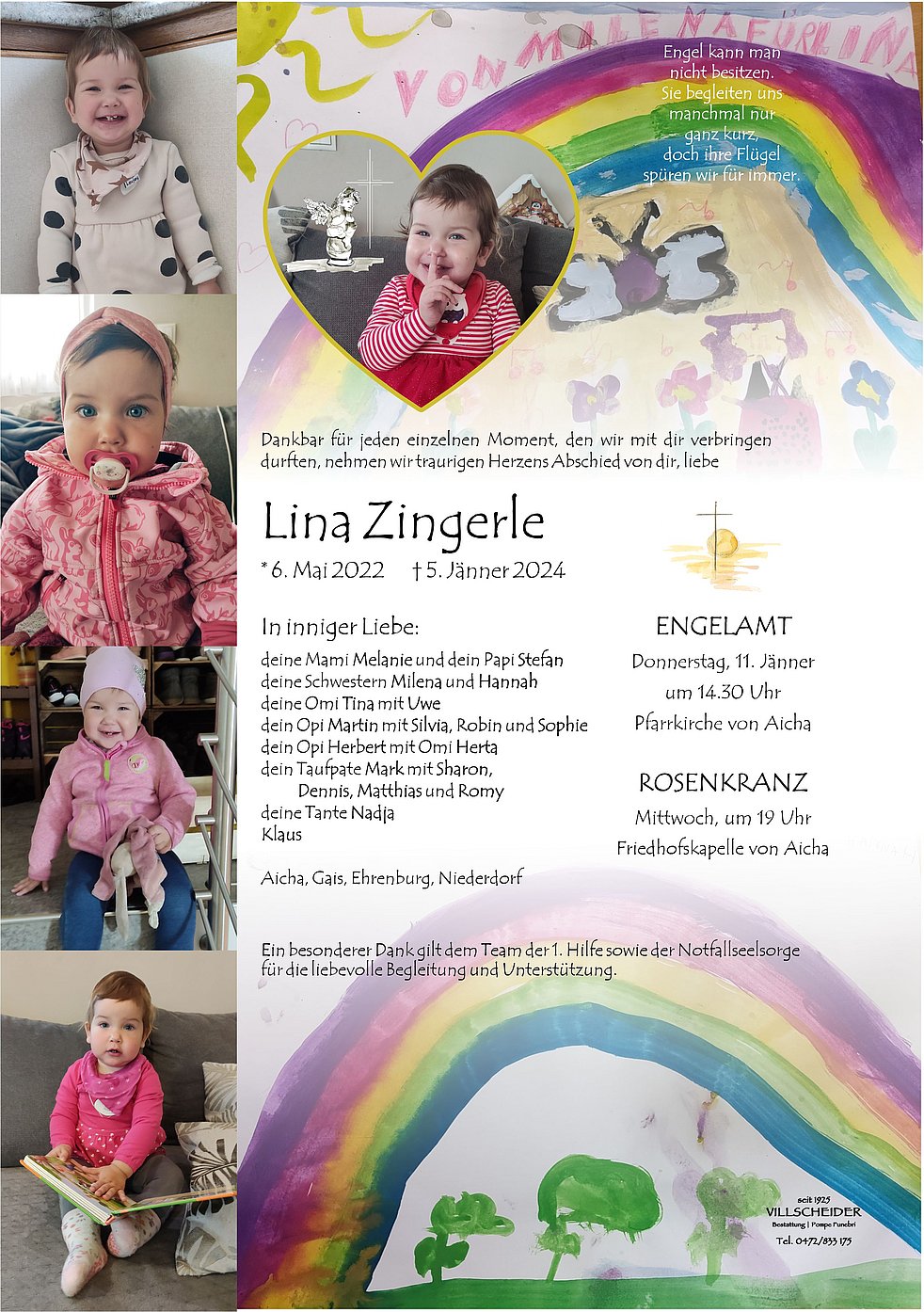Viel zu früh und plötzlich, bist du als kleiner Engel von dieser Welt gegangen.Deine Eltern,deine Schwestern,deine Oma's-Opa's,Verwandte und Bekannte alle trauern sie um dich.Wir finden keine Worte für den schweren Verlust und beten für dich und deine Familie.Liebe Melli,lieber Stefan und Schwestern von Lina unser herzliches Beileid viel,viel Kraft in dieser schweren Zeit und dass irgendwenn für enk wido di Sunne scheint.Ruhe in Frieden kleiner Engel