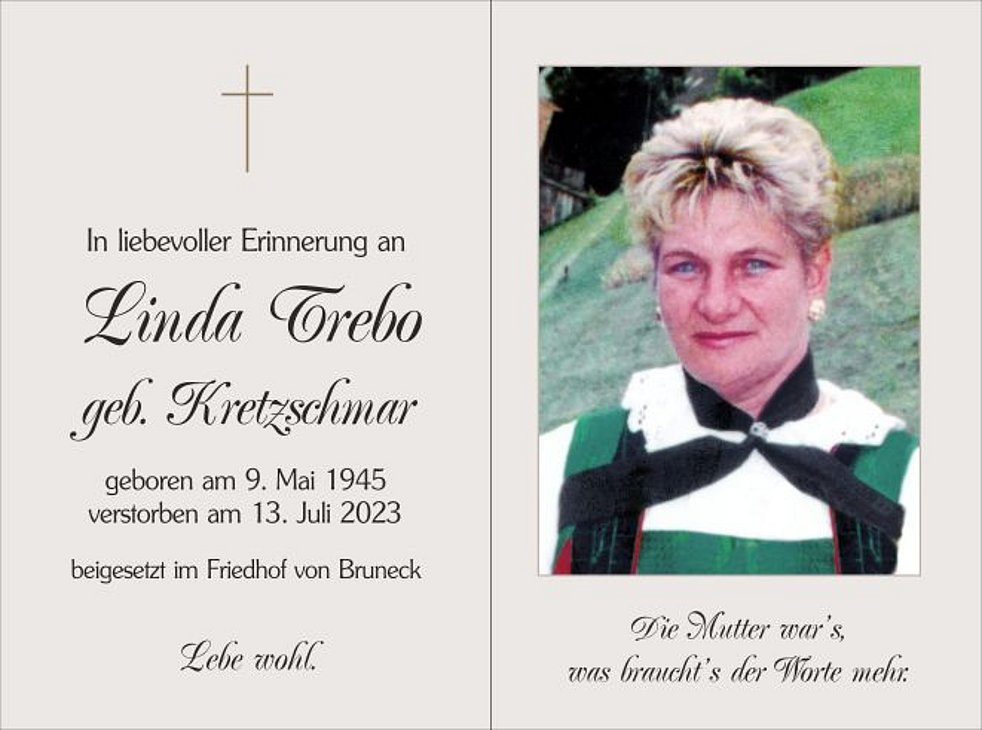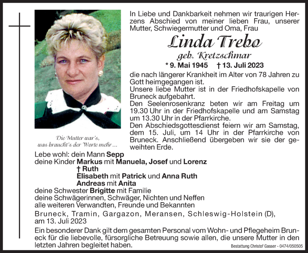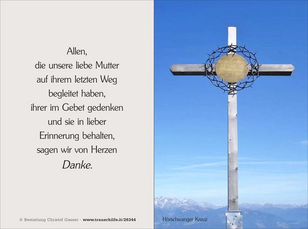 Ein besonderer Dank gilt dem gesamten Personal vom Wohn- und Pflegeheim Bruneck für die liebevolle, fürsorgliche Betreuung sowie allen, die unsere Mutter in den letzten Jahren begleitet haben.