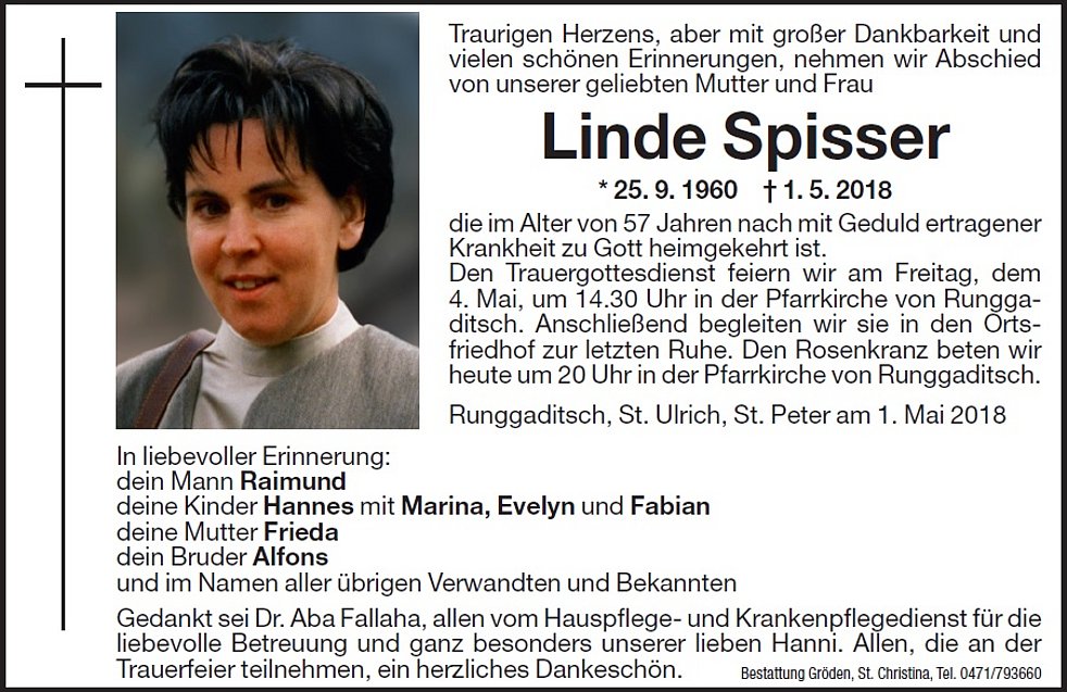 Den Trauergottesdienst feiern wir am Freitag, dem 04. Mai, um 14.30 Uhr in der Pfarrkirche von Runggaditsch. Anschließend begleiten wir sie in den Ortsfriedhof zur letzten Ruhe.