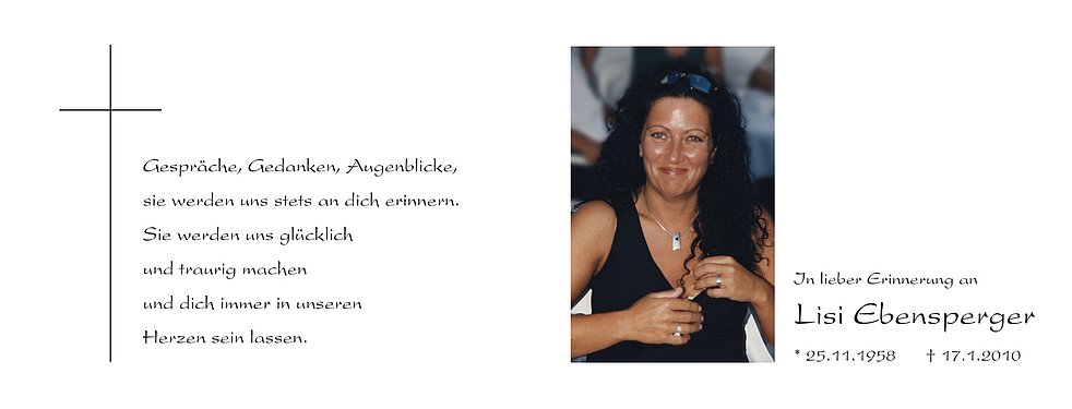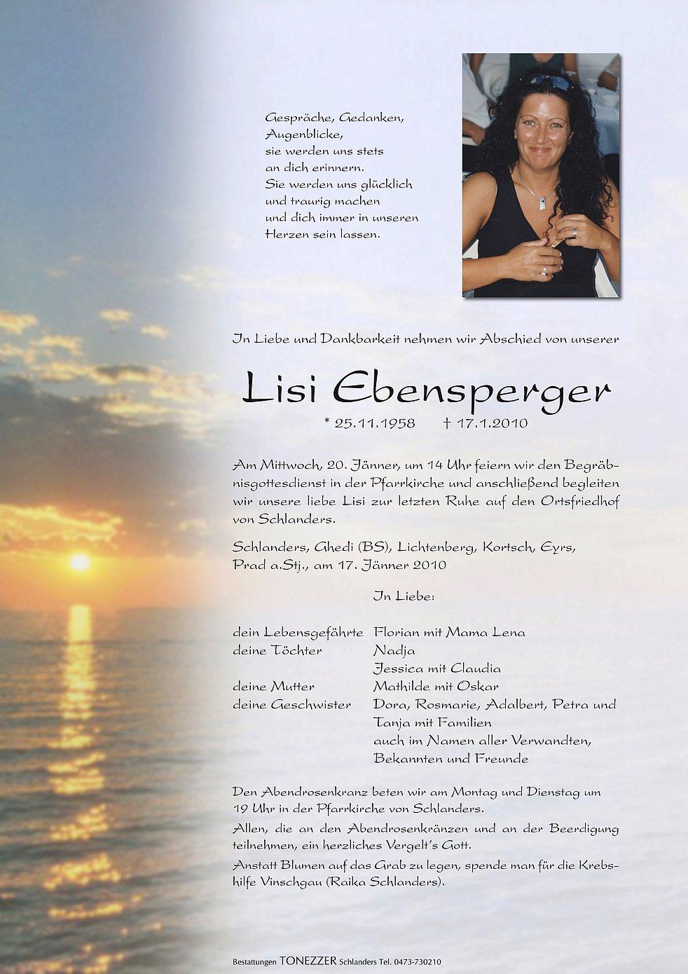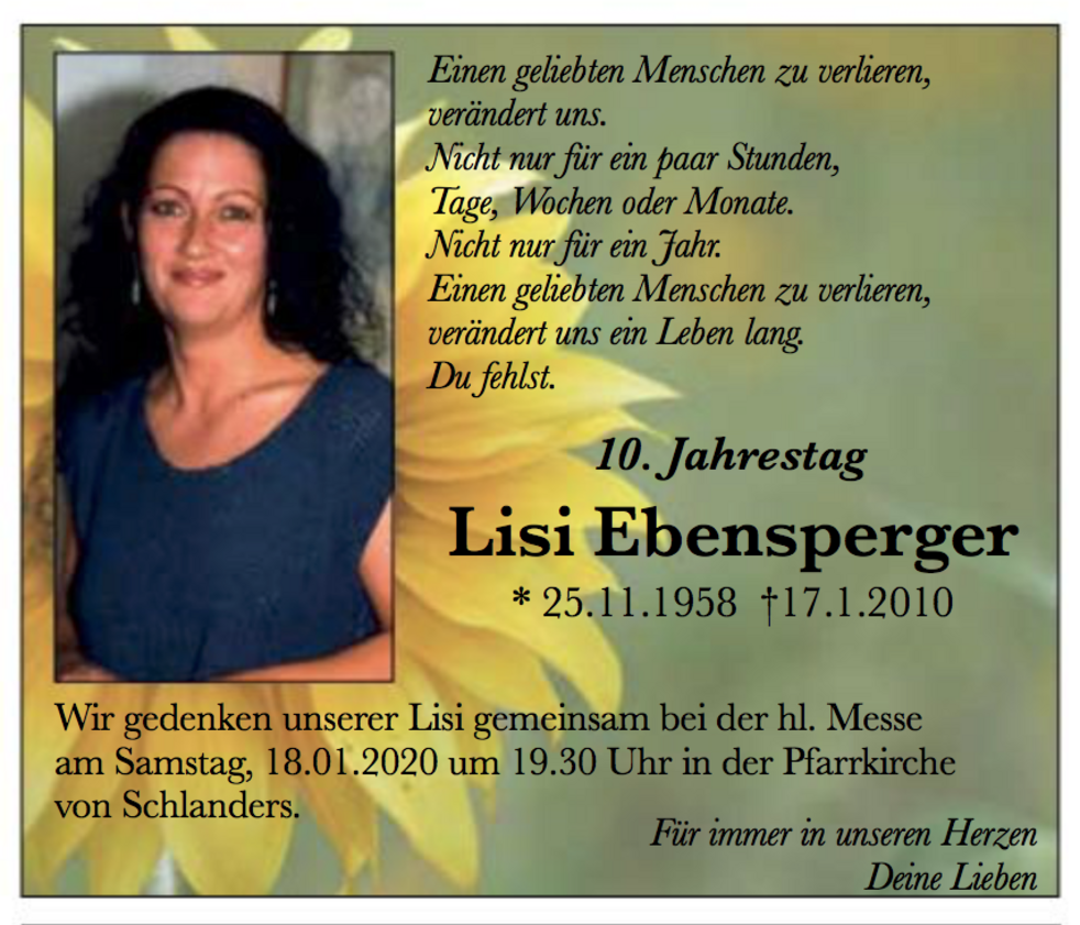Am Mittwoch, 20. Jänner, um 14 Uhr feiern wir den Begräbnisgottesdienst in der Pfarrkirche und anschließend begleiten wir unsere liebe Lisi zur letzten Ruhe auf den Ortsfriedhof von Schlanders.