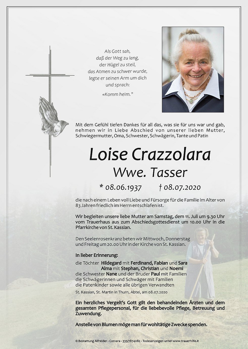 Wir begleiten unsere liebe Mutter am Samstag, dem 11. Juli um 9.30 Uhr vom Trauerhaus aus zum Abschiedsgottesdienst um 10.00 Uhr in die Pfarrkirche von St. Kassian.