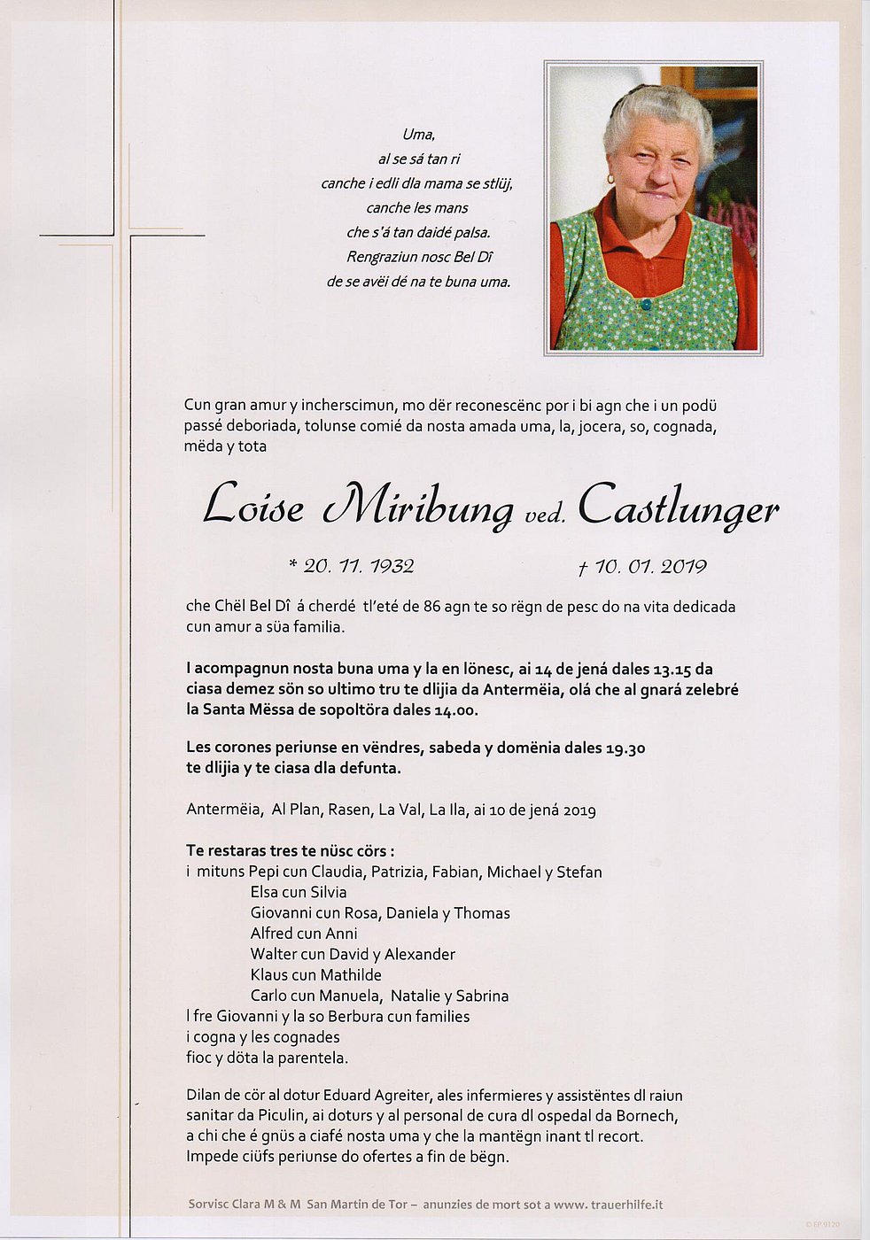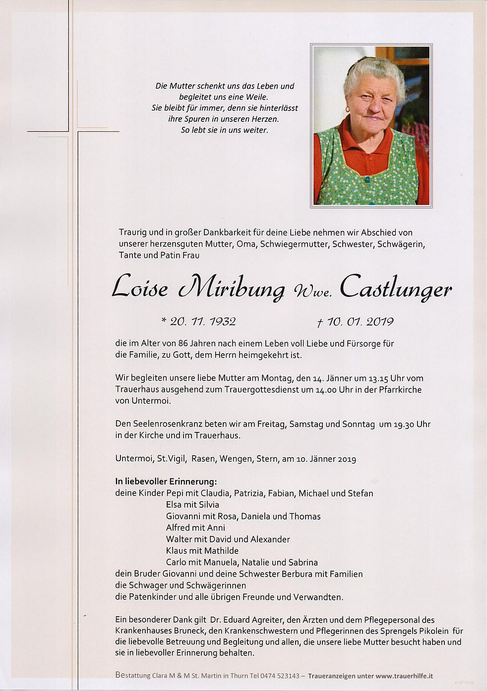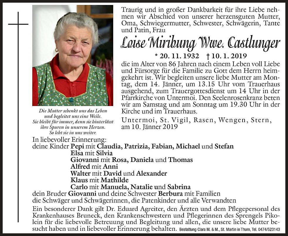 Ein besonderer Dank gilt Dr. Eduard Agreiter, den Ärzten und dem Pflegepersonal des Krankenhauses Bruneck, den Krankenschwestern und Pflegerinnen des Sprengels Pikolein für die liebevolle Betreuung und Begleitung und allen, die unsere liebe Mutter besucht haben und sie in liebevoller Erinnerung behalten.