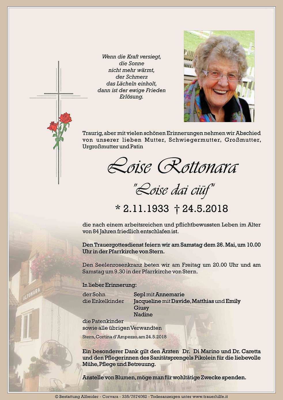 Ein besonderer Dank gilt den Ärzten Dr. Di Marino und Dr. Caretta und den Pflegerinnen des Sanitätsprengels Pikolein für die liebevolle Mühe, Pflege und Betreuung.