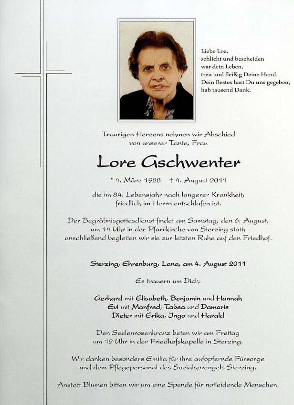 von Sterzing statt; anschließend begleiten wir sie zur letzten Ruhe auf den Friedhof.