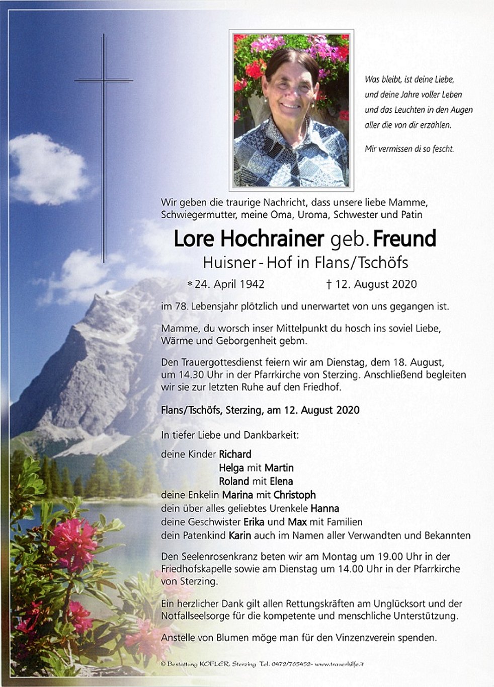 Den Trauergottesdienst feiern wir am Dienstag, dem 18. August, um 14.30 Uhr in der Pfarrkirche von Sterzing. Anschließend begleiten wir sie zur letzten Ruhe auf den Friedhof.