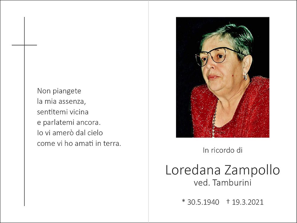La S. Messa in suffragio verrà celebrata martedì, 23 marzo alle ore 14.00 nella chiesa parrocchiale San Giovanni Bosco, indi la nostra cara verrá cremata.